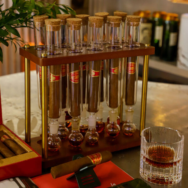 Aroma epruvete za tompuse omogućavaju precizno i elegantno čuvanje aroma cigara, čuvajući kvalitet i miris svakog tompusa. Set od 10 staklenih epruveta sa drvenim stalakom olakšava organizaciju i pregled, a svaka epruveta dolazi sa čepom za očuvanje svežine. Idealno je rešenje za ljubitelje cigara koji žele da kombinuju praktičnost i luksuz u svom ritualu uživanja.