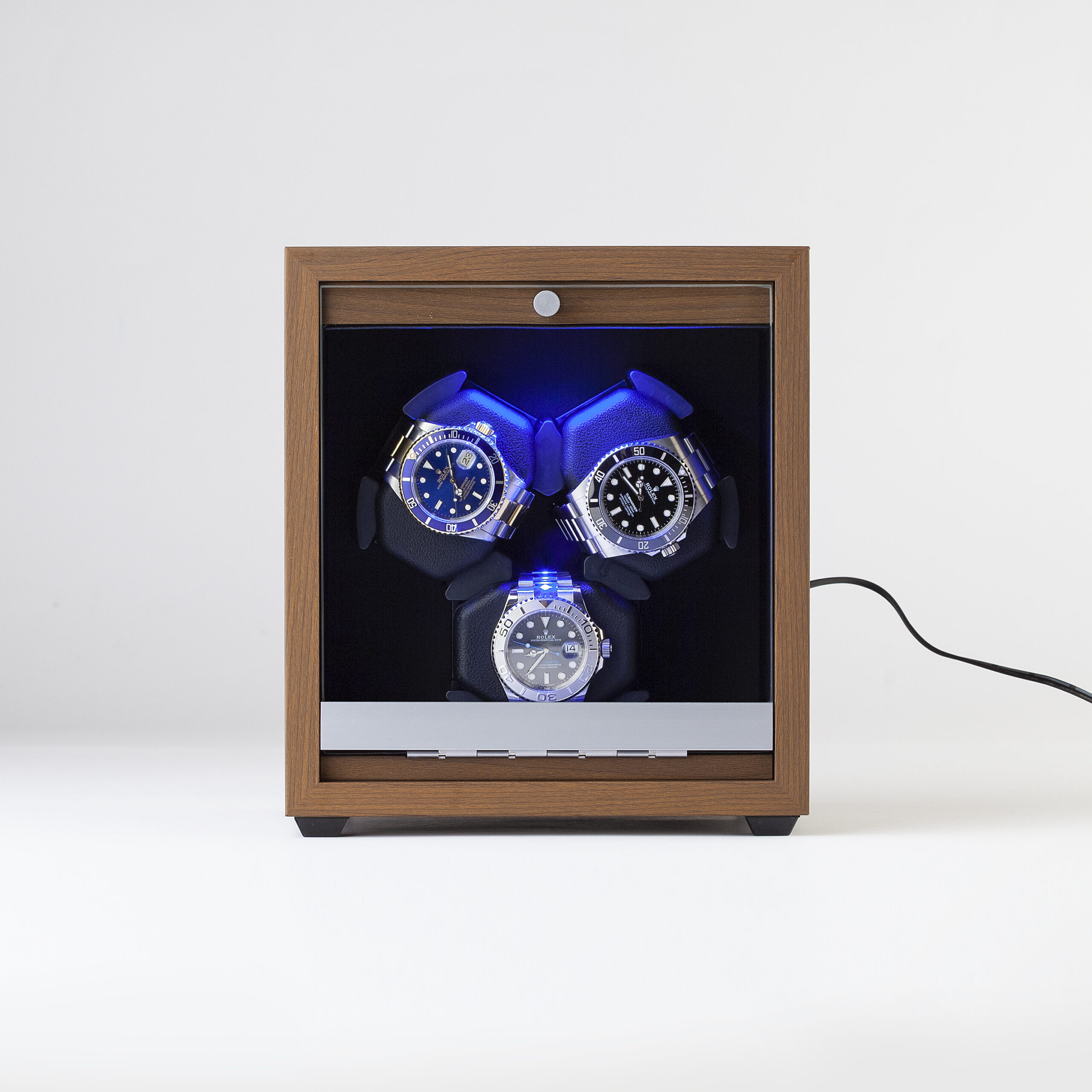 Smesti svoja tri automatska sata u ovu otmenu kutiju i budi sigurna da sun a bezbednom, al ii da će brzo i efikasno biti navijeni. Dok process traje, ti uživaj u opuštajućem plavom svetlu koji okružuje tvoje ljubimce.
