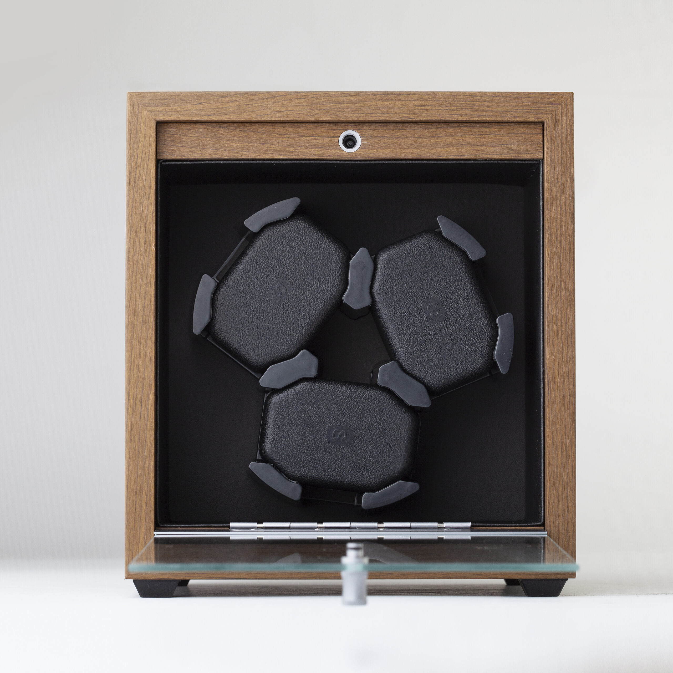 Automatski sat je potrebno nositi na ruci 10 do 15 sati kako bi se napunio. Sa tri sutomatska sata moraš priznati da je gotovo nemoguće da svi budu navijeni. Nezavisno od njihovih tehničkih osobina i performansi, makar dva će uvek biti neaktivna. To može biti problem ukoliko baš neki od onih koji su stali poželiš da nosiš. Rešenje koje tražiš nudi ti ova kutija! Automatska kutija za satove 3 Cabinet dizajnirana je da pruži najbolji tretman tvojim automatskim satovima, ali i da ulepša prostor u koji je smestiš. Kutija je izrađena od viskokvalitetnog drveta, sa bočnim otvaranjem. Pogled na tvoje satove omogućava ti providni pleksiglas. Napredni mehanizam skriven iza jastučića za satove garantuje njihovo brzo i nečujno navijanje. Posebnu atraktivnost ovoj kutiji dodaju ugrađena plava LED svetla iza rotacionih jastučića. Navijanje i svetlosni šou istovremeno posebno privlačni mogu biti kolekcionarima satova.
