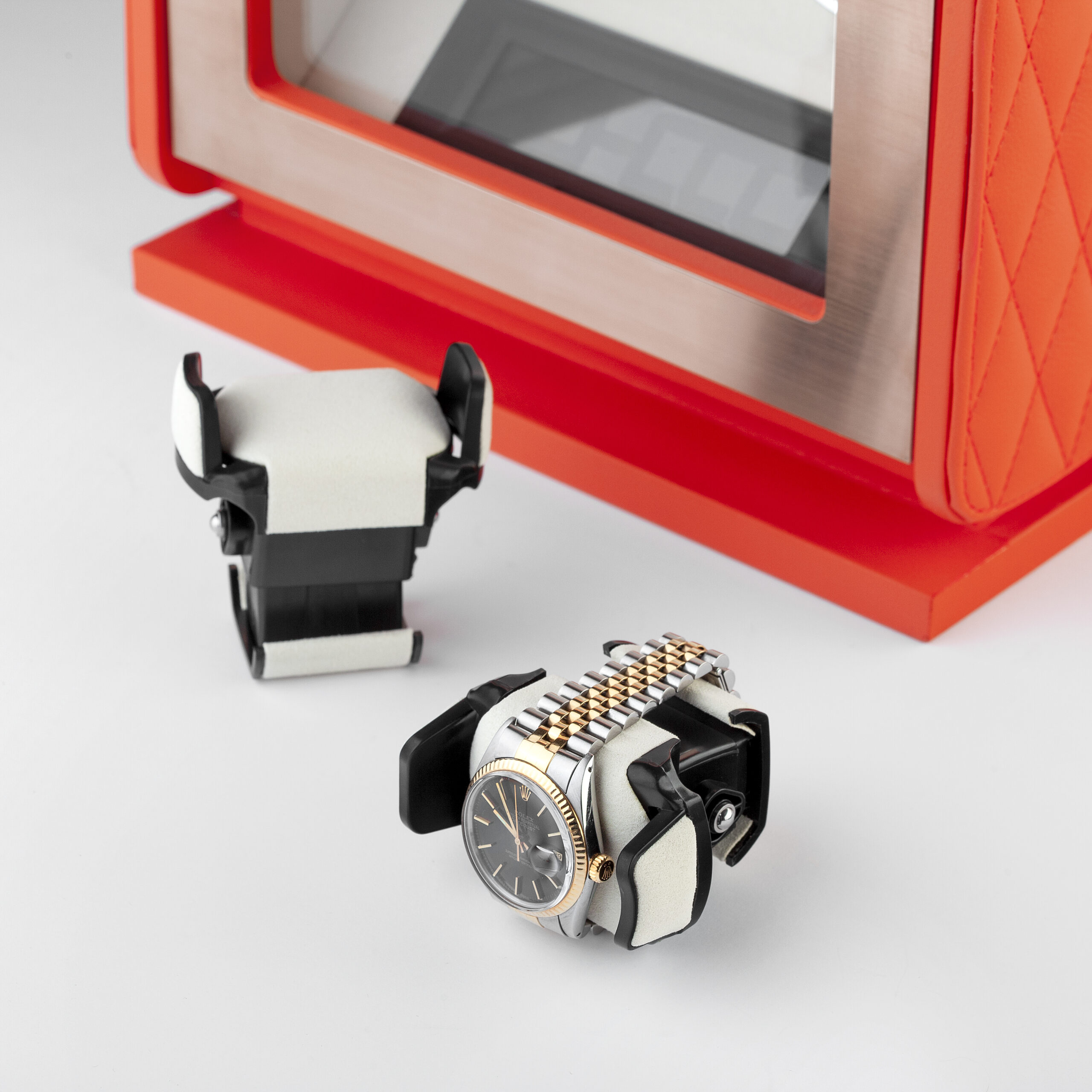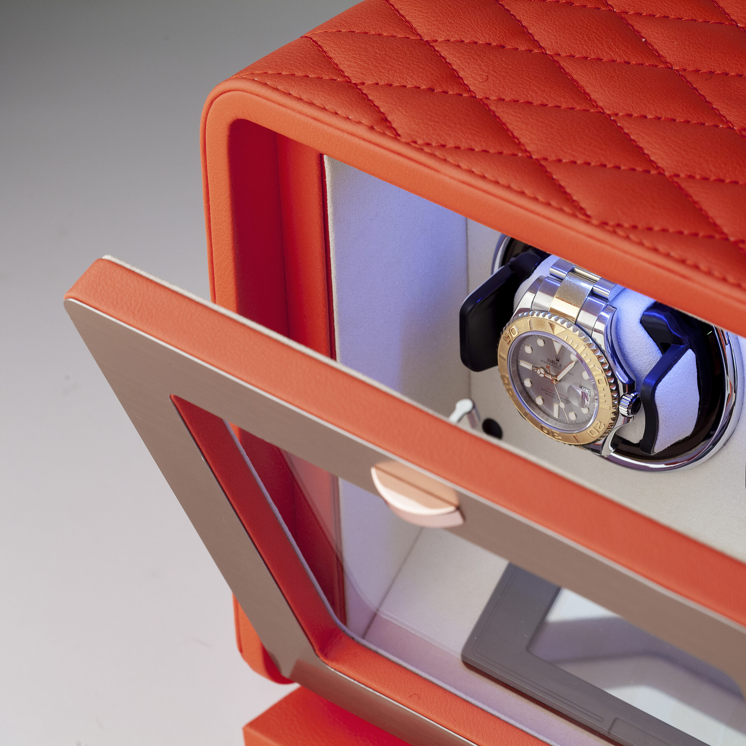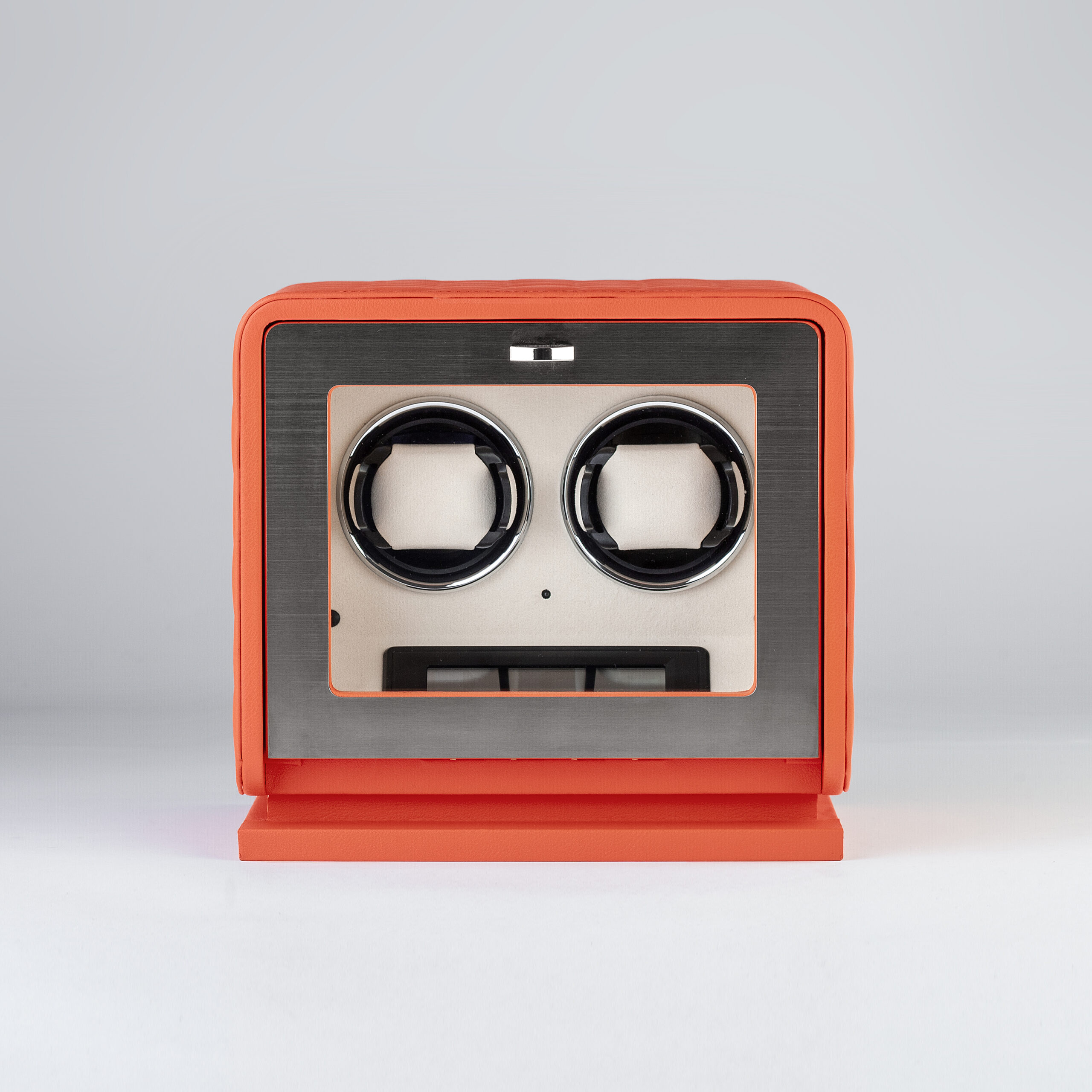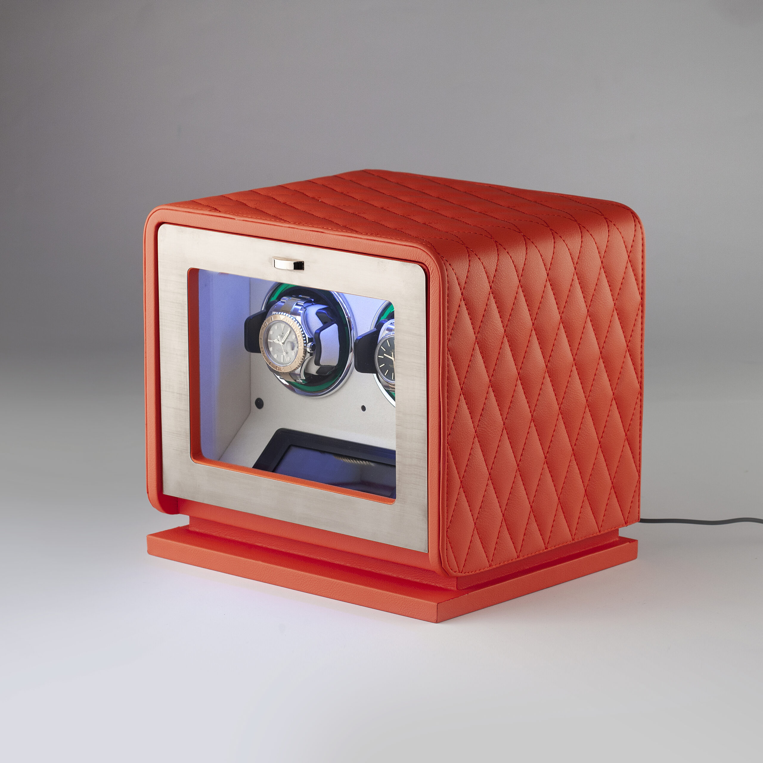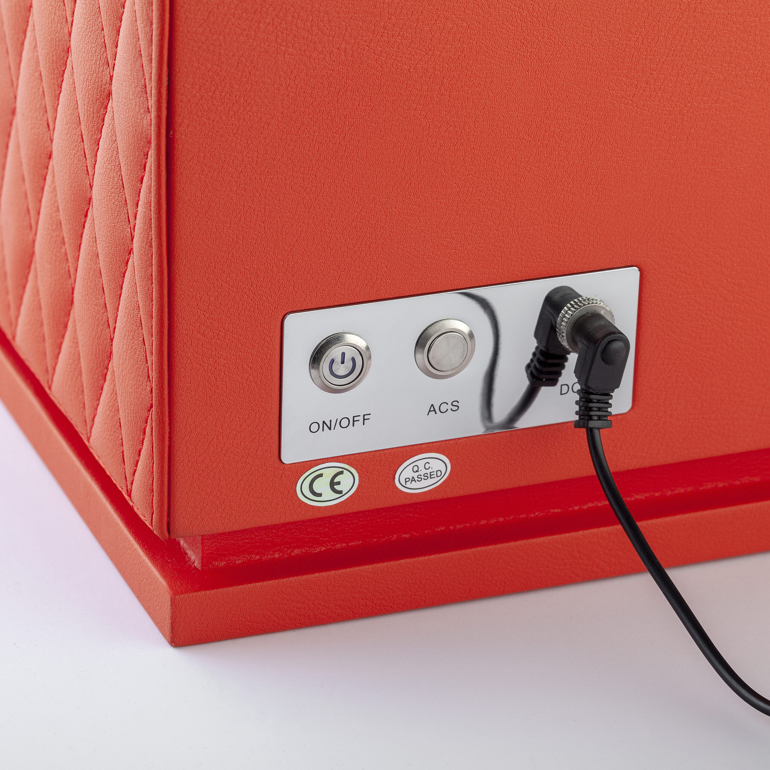 Ukoliko ti treba jedan upadljiv detalj u prostoriji, a i rešenje za smeštanje i navijanje dva automatska sata, Automatska kutija za satove 2 Retro box je tvoje rešenje! Kombinacija narandžaste kože, bele unutrašnje plastike i plavog LED svetla sve je samo ne dosadna.