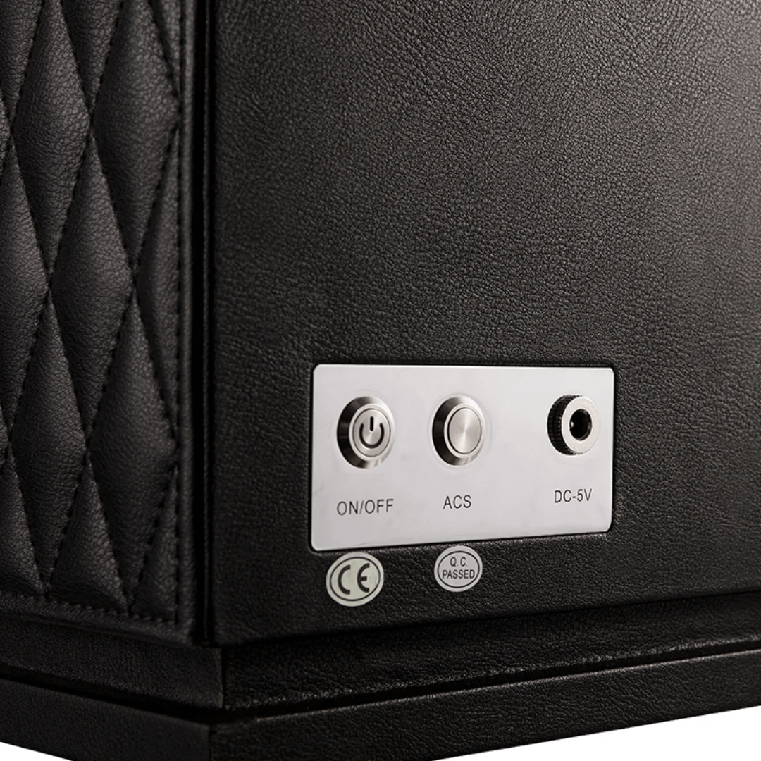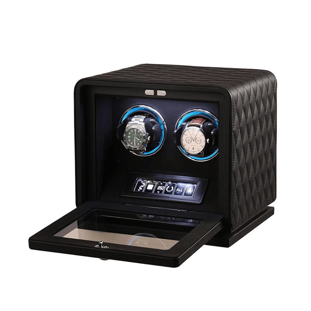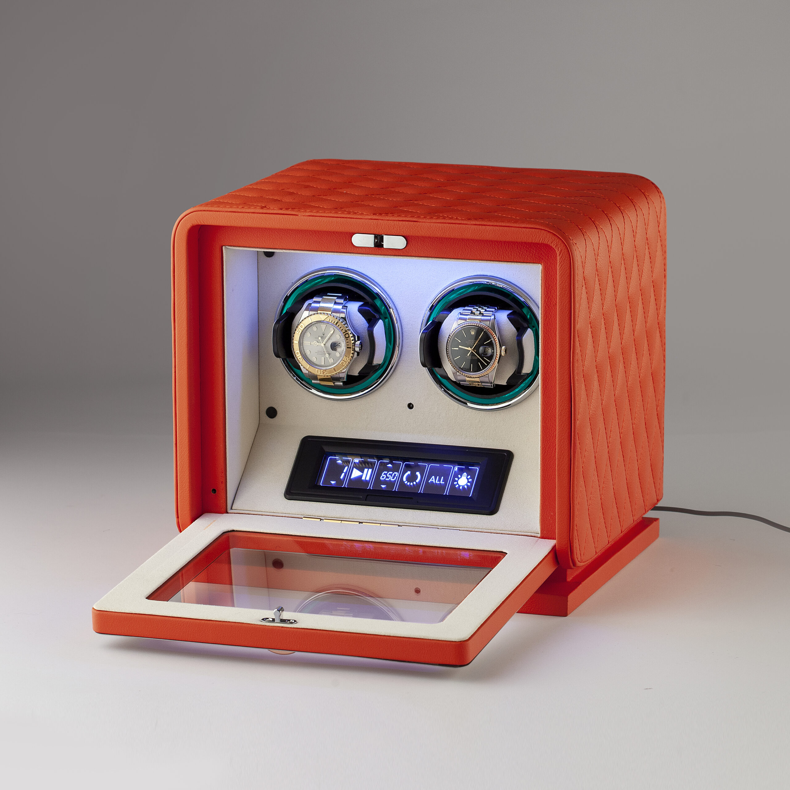 Automatska kutija za satove 2 Retro box ne zna šta je ravnodušnost. Ova kutija osvaja na prvi pogled, kako kolekcionare automatskih satova, tako i one koji imaju samo dva automatska sata. Za njihove ljubimce osmišljen je poseban mehanizam i upotpunjen neobičnim dizajnom. Kutija je malih dimenzija, taman da se lako smesti u svaku prostoriju. Otvaranje, odnosno zatvaranje je sa bočne strane, koja je od providnog pleksiglasa. On pruža mogućnost odličnog pogleda na satove, koje posebno lepo ističe plavo svetlo iza rotacionih jastučića. Podešavanje režima rada kutije moguće je lako izvršiti preko LCD ekrana osetljivog na dodir, kao i daljinskog upravljača. Navijanje satova vrši se nečujno, uz pomoć motora smeštenog u unutrašnjost kutije.