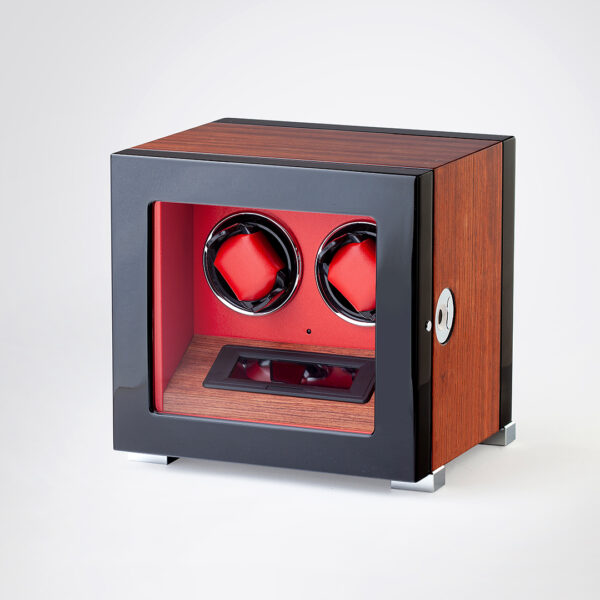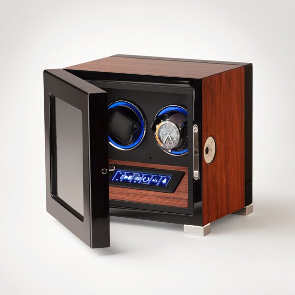 Automatska kutija za satove – Rose Touch 2 je luksuzni winder za satove koji kombinuje moderan dizajn, naprednu tehnologiju i vrhunsku funkcionalnost. Namenjena je čuvanju i automatskom navijanju 2 automatska sata, uz touch screen kontrolu i otključavanje na otisak prsta, što pruža dodatnu sigurnost i praktičnost. Elegantna kombinacija ružinog drveta, crnih i srebrnih detalja sa crvenim enterijerom i plavim RGB osvetljenjem čini je atraktivnim dodatkom svakom prostoru. ⌚✨