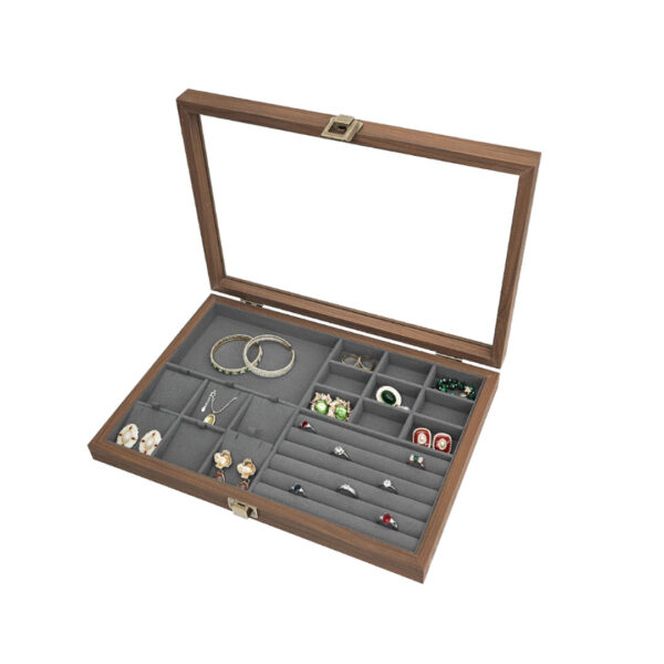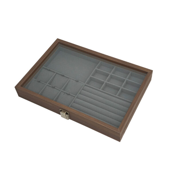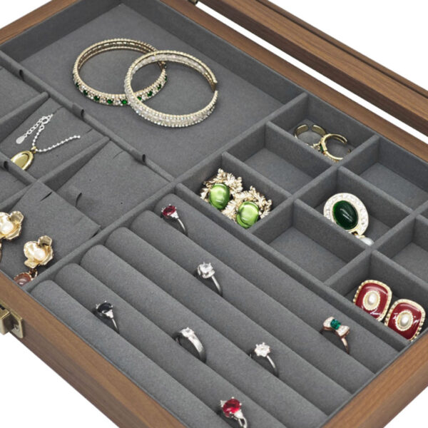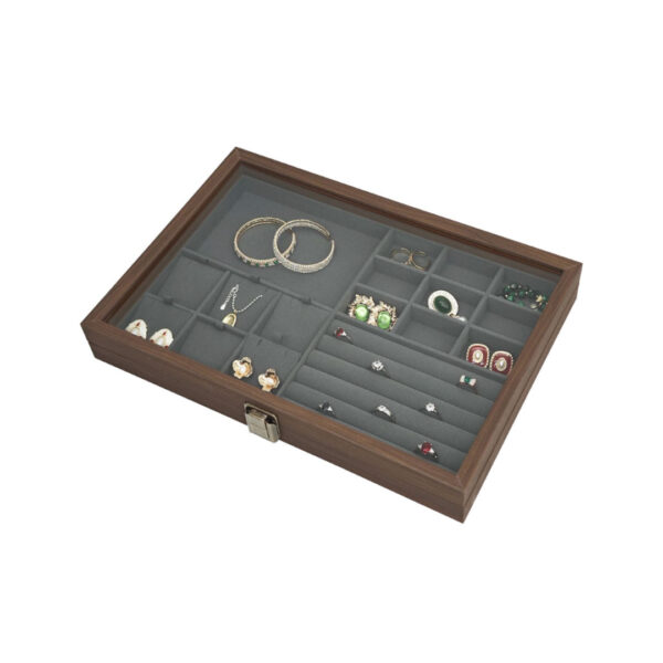 Zahvaljujući staklenom poklopcu, sadržaj kutije je uvek vidljiv, što omogućava brz i lak izbor nakita bez otvaranja. Njen tanak i moderan dizajn čini je savršenom za odlaganje u fioku ili izlaganje na komodi.