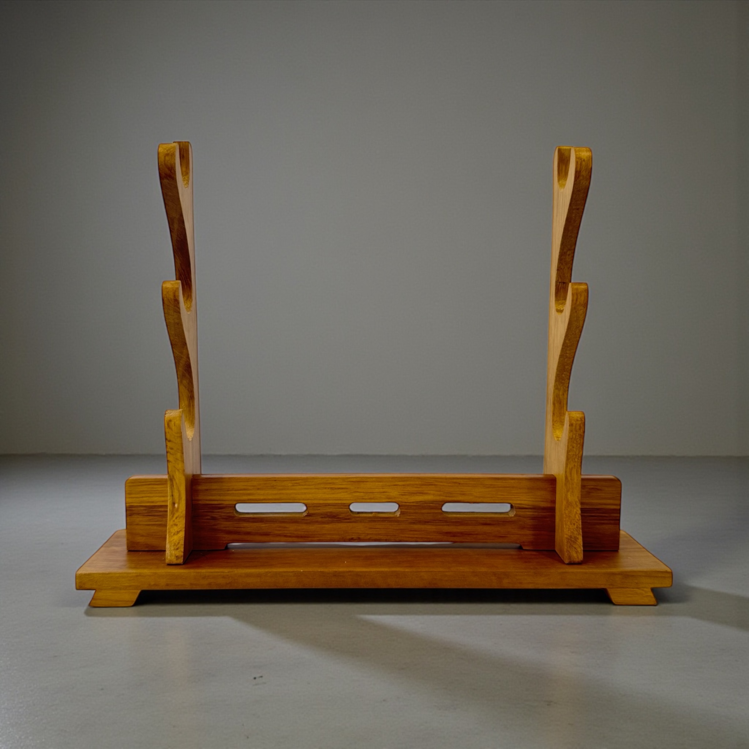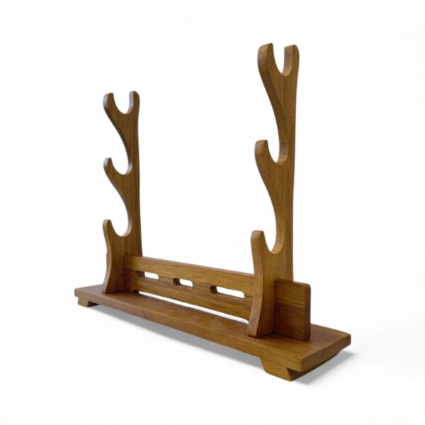 Ovaj stalak za katane u svetloj boji drveta donosi toplinu i eleganciju u svaki prostor. Omogućava uredno i pregledno izlaganje katana, ističući njihov dizajn bez preopterećenja prostora.