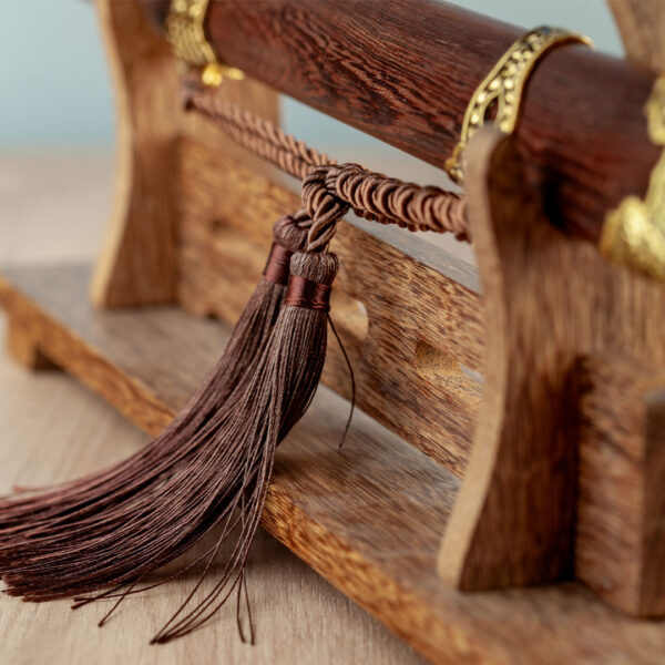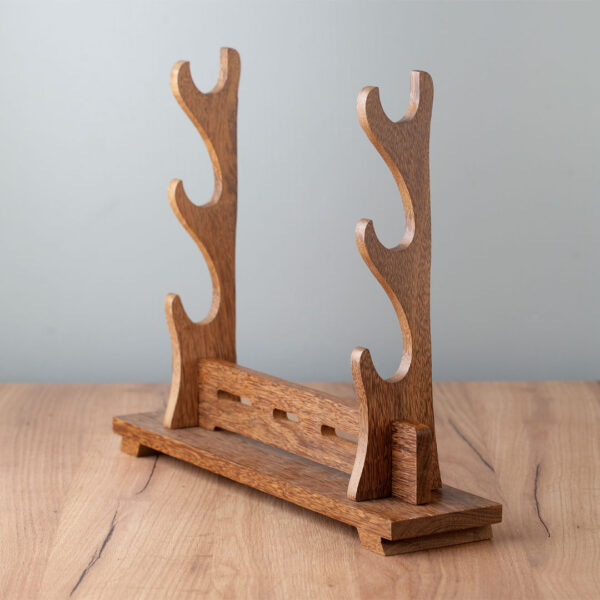 Ovaj stalak za tri katane omogućava elegantno i organizovano izlaganje više mačeva na jednom mestu. Izrađen je od drveta u tamnoj boji, što mu daje klasičan izgled, idealan za kolekcionare i ljubitelje orijentalne estetike.