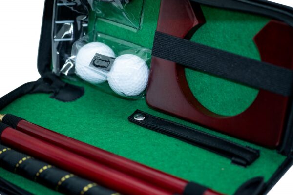 Za momentalno prekraćivanje dosade, bilo gde da se nalaziš, Ekspedicija ima jedinstven set. To je golf set standard, koji sadrži sve što ti je potrebno za igru, bez obzira da li si amater ili profesionalac. Set spolja izgleda kao crna futrola koja se zatvara rajsferšlusom. Unutrašnjost je presvučena mekim zelenim materijalom koji asocira na travnato polje za golf. Prostor je maksimalno iskorišćen. Štap je od drveta, kao i obeleživač cilja, odnosno rupice. U setu se nalaze i dve loptice. Zbog veličine, set je idealan za putovanja.