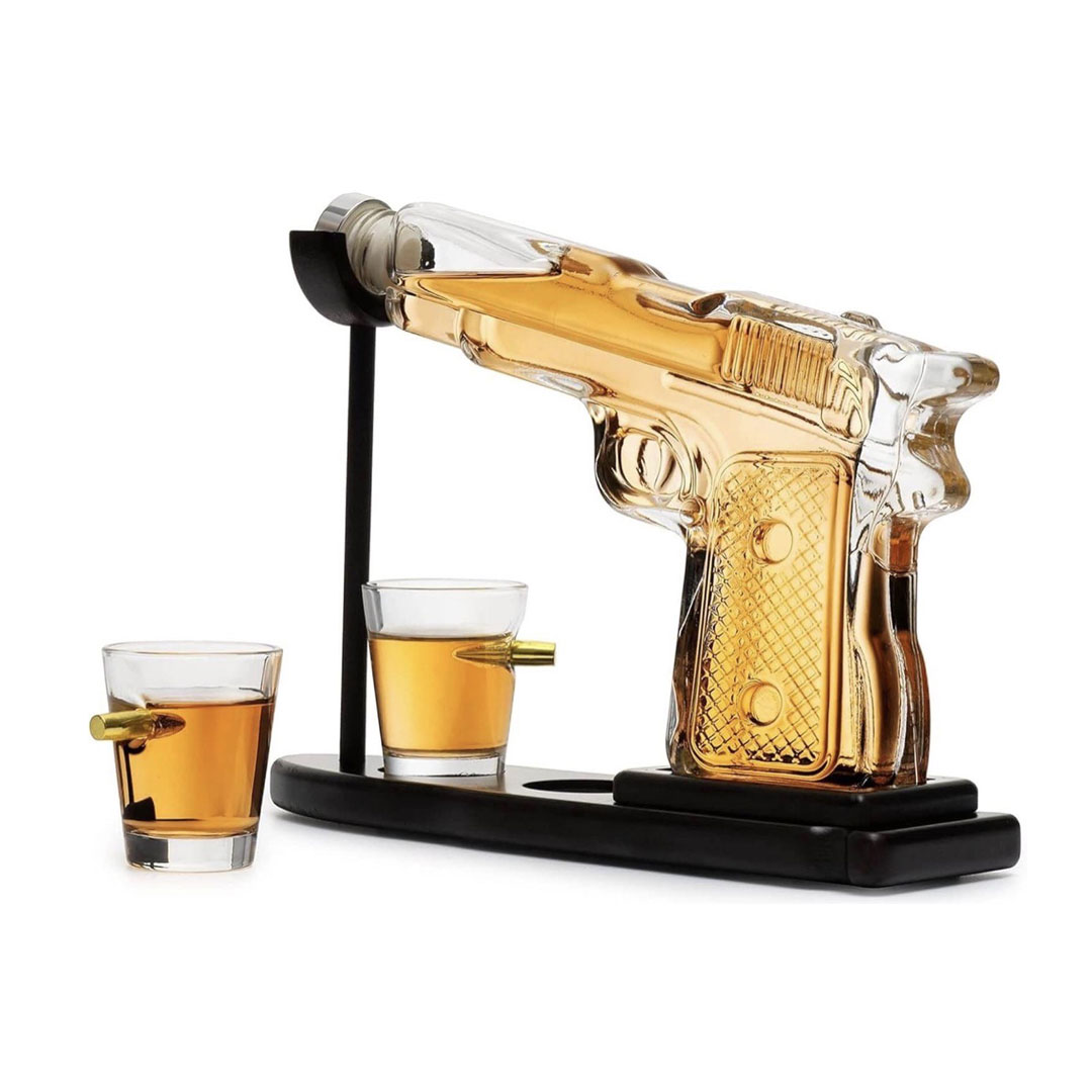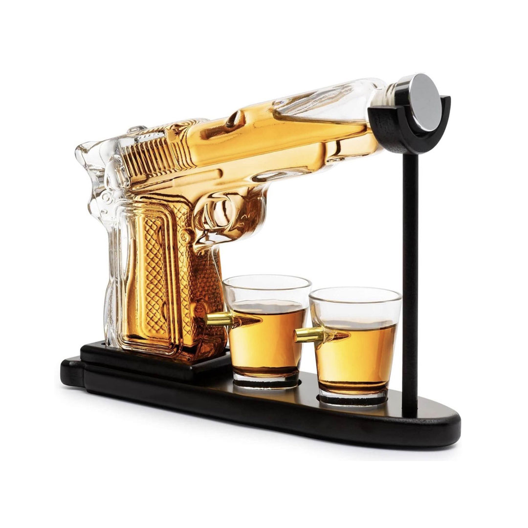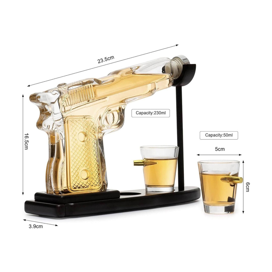 - U setu: Pištolj dekanter, dve čašice i drveno postolje