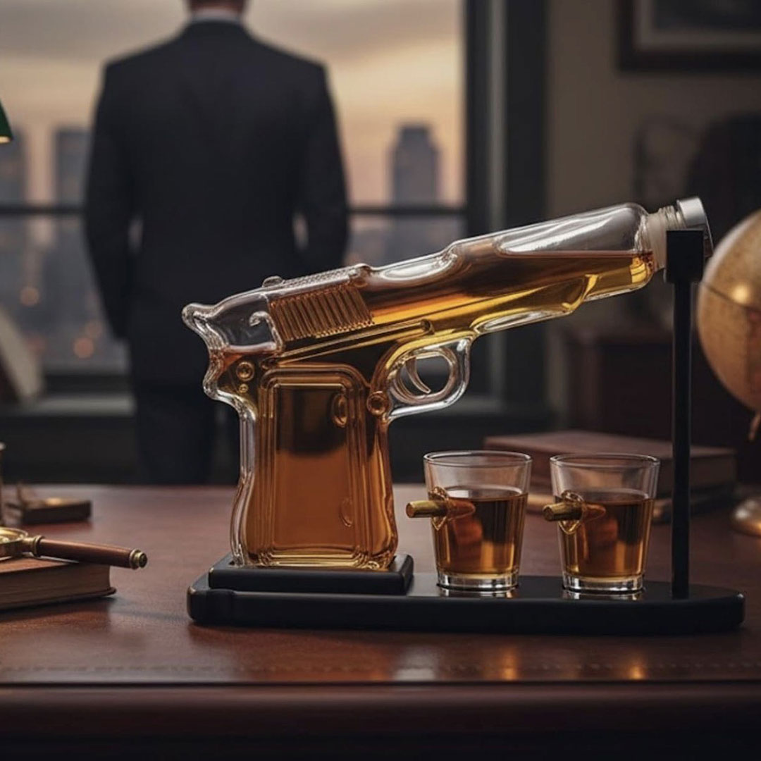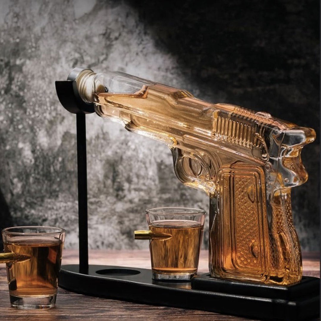 Unesite originalnost i stil u svaki tenutak uživanja uz Gun set za rakiju! Set je izrađen od visokokvalitetnog borosilikatnog stakla postavljenog na elegantno drveno postolje. Dve čašice sadrže zanimljiv detalj – metak zaglavljen u staklu, što dodatno naglašava jedinstvenost kompleta.