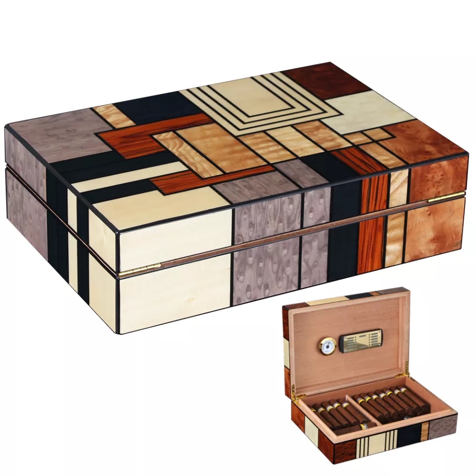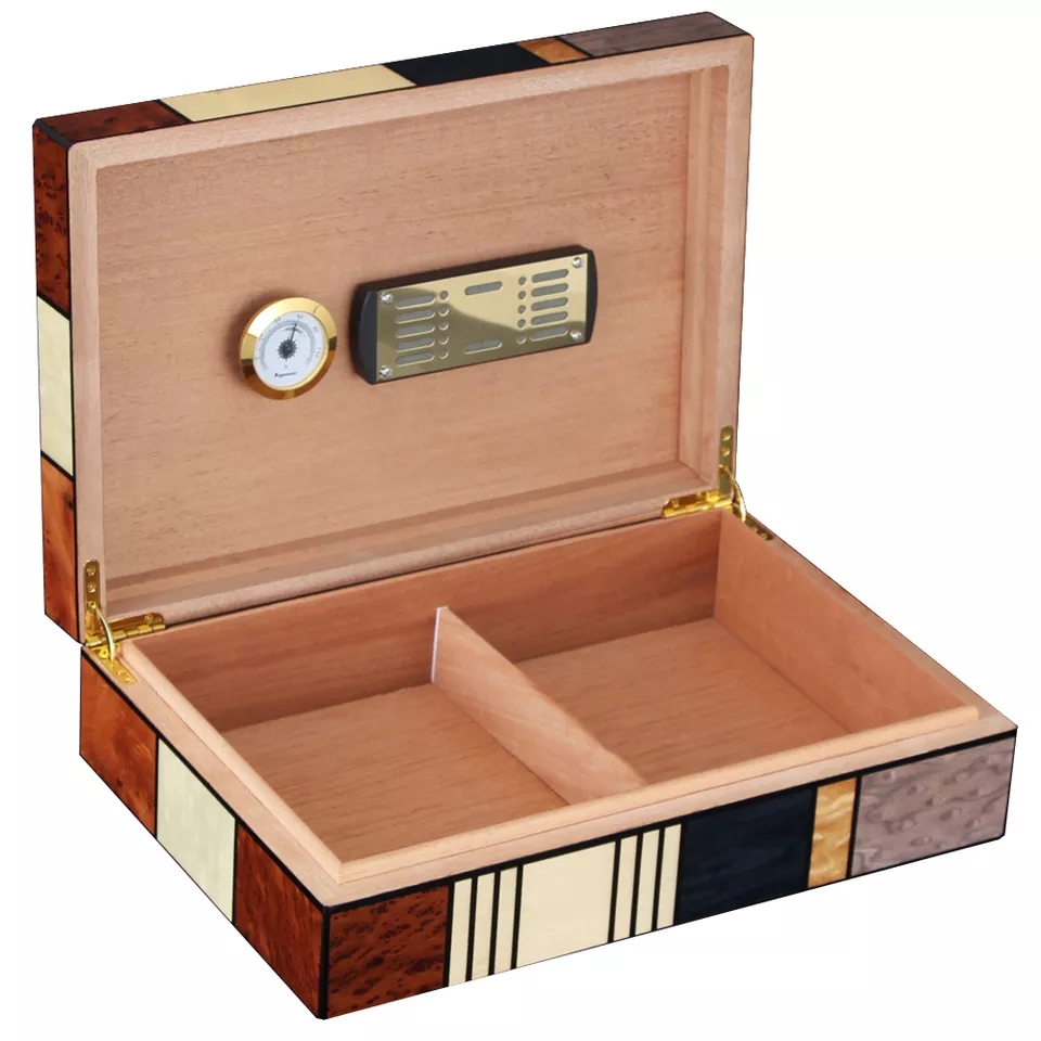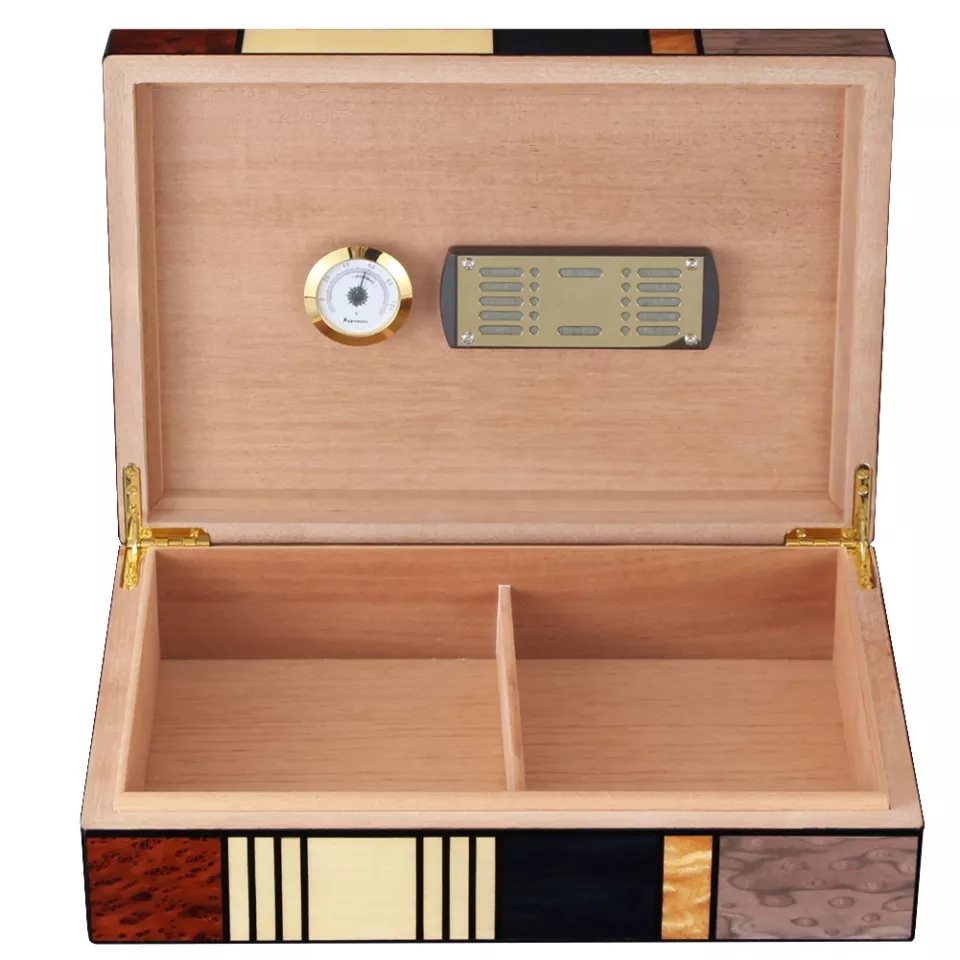 Osim cigarama, ljubitelje istih možeš obradovati kutijom za cigare. Hjumidori su nezaobilazni predmet koji čuva karakteristike cigara. Tome doprinose kvalitetno drvo od kog su izrađeni i merač vlažnosti. Hjumidor Lux Srednji RA952 delo je italijanskog proizvođača Lubinski i pogoduje smeštanju oko 25 cigara. Napravljen je od španskog kedra, vrste drveta koja se već pokazala kao odlična za pravljenje kutija za cigare. Poklopac kutije pričvršćen je metalnim šarkama od nerđajućeg čelika. Ispod poklopca nalazi se merač vlažnosti. U kutiji je jednom pregradom organizovan prostor na dva odeljka jednakih veličina. Kutiju luksuznom čini, pored kvalitetnih materijala, njen spoljašnji izgled. Reč je o geometrijskom dizajnu sa toplim zemljanim tonovima. Hjumidor Lux je odličan izbor ako poklon mora da ispuni dva uslova- lep i koristan.