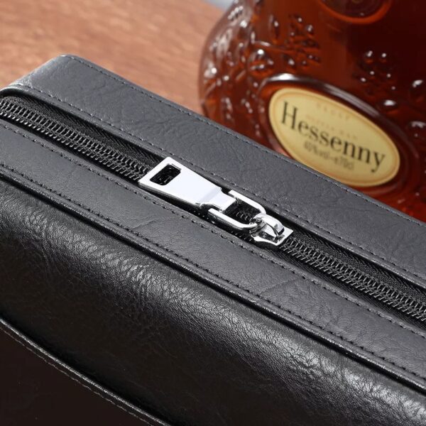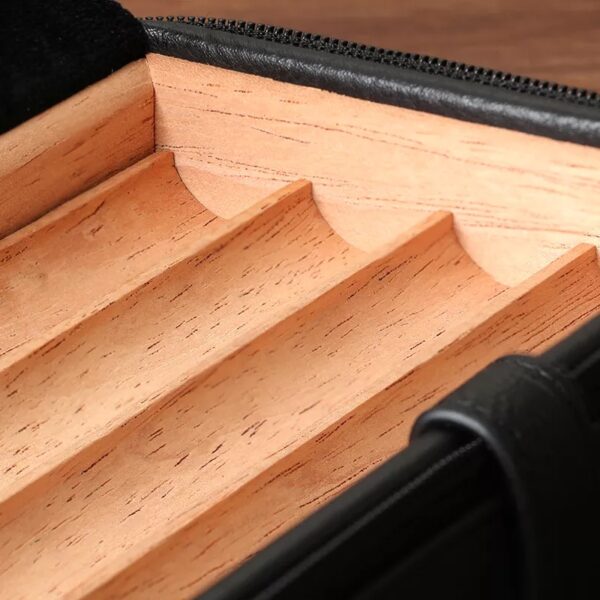 Na drugoj strani je drveno postolje predviđeno za četiri tompusa, pričvršćeno kožnom trakom za zaštitu cigara. Sve što je potrebno da uradiš pre putovanja, kako bi zaštitio svoje ljubimce, jeste da dodaš destilovanu vodu u ovlaživač kako bi cigare zadržale neophodnu vlagu i da uživaš u njima i putovanju!