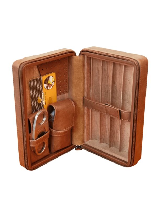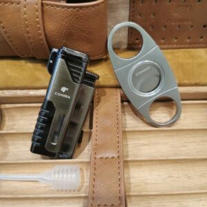 Humidor Putni Kozni set T104 Zahvaljujući putnom hjumidoru Cohiba T104 tompusi će biti zaštićeni od spoljašnjih oštećenja i zadržaće svoj kvalitet. Ova putna torba za cigare dizajnirana je tako da zauzme malo mesta u koferu i da na potpuno bezbedan način odložiš i transportuješ cigare. Kutija je pravougaona, obložena kožom smeđe boje. Zatvaranje je uz pomoć rajsferšlusa iste boje. Sa jedne strane u unutrašnjosti, kožne pregrade kriju sekač za tompuse, upaljač i ovlaživač.