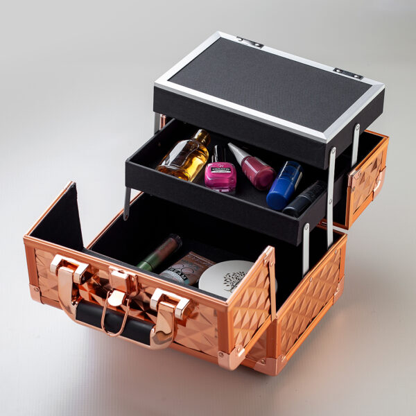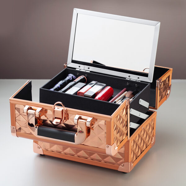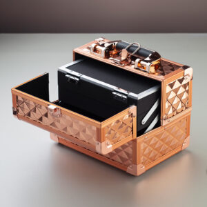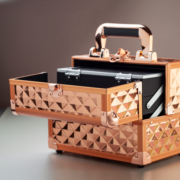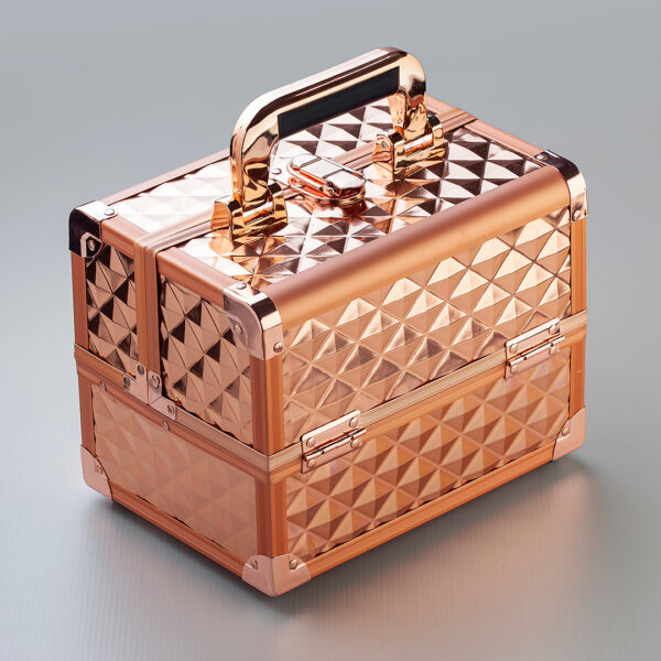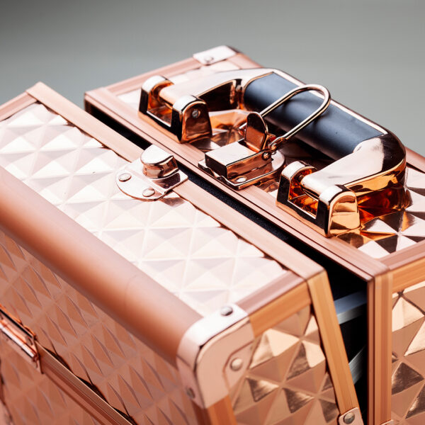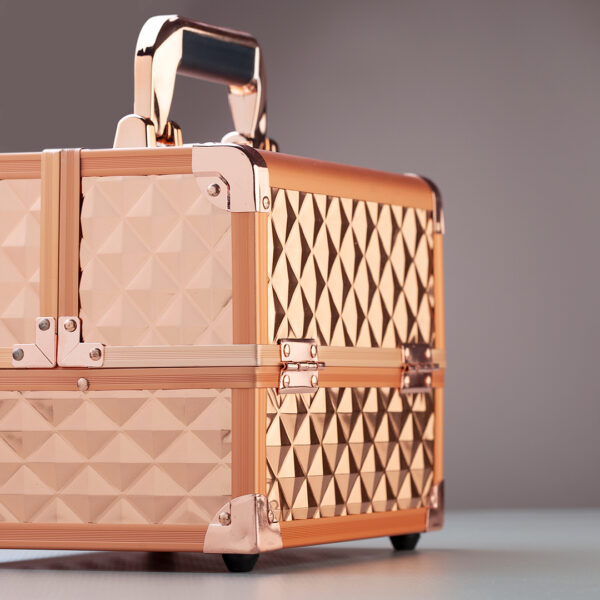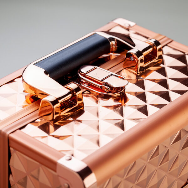 Kofer je načinjen od kvalitetnog materijala otpornog na oštećenja. Unutrašnjost je crne boje, dok je spoljašnjost visokog sjaja, u boji roze zlata.
