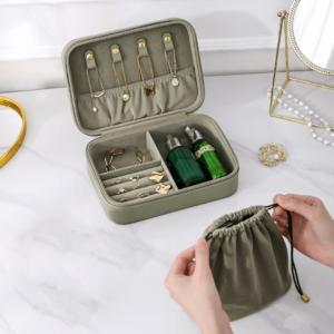 Ova elegantna i funkcionalna kutija za nakit izrađena je od kvalitetne veštačke kože u maslinasto zelenoj ili bež boji, koja je vodootporna i otporna na prašinu, čime pruža dodatnu zaštitu za vaš nakit. Savršen je saputnik na putovanjima, s dimenzijama koje omogućavaju lako pakovanje u prtljag. Unutrašnjost kutije obložena je mekim velurom koji štiti dragocenosti od ogrebotina. Uređena je s posebnom pažnjom na organizaciju – ima kukice za ogrlice s kožnim zatvaračima koji sprečavaju njihovo zapetljavanje, pregrade za prstenje i male pregrade za minđuše i ukosnice. Veliki prostor omogućava smeštaj većih komada nakita ili čak kozmetike, dok dodatna torbica za nakit može da se koristi zasebno. Ova kutija za nakit nije samo praktična, već je i idealan poklon koji nosi dozu elegancije i pažnje prema detaljima, bilo za vas ili za vaše voljene.