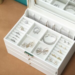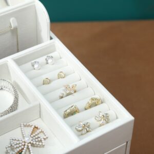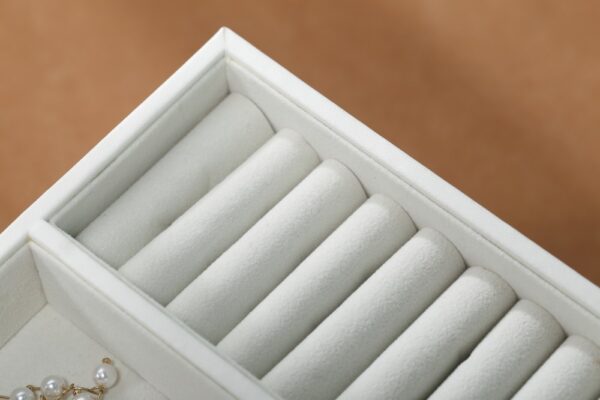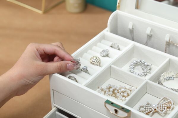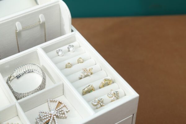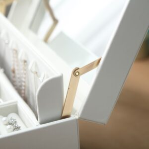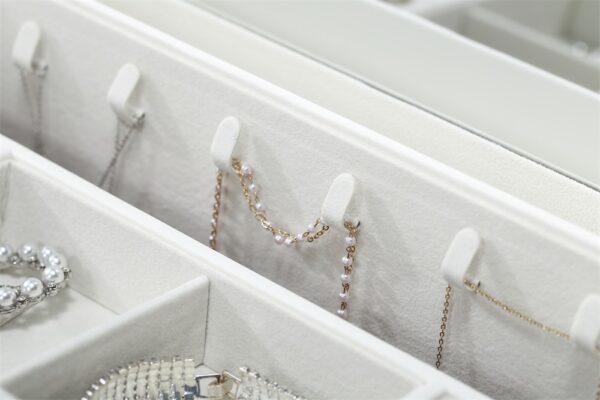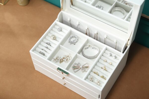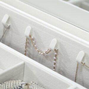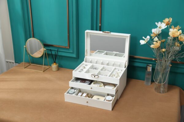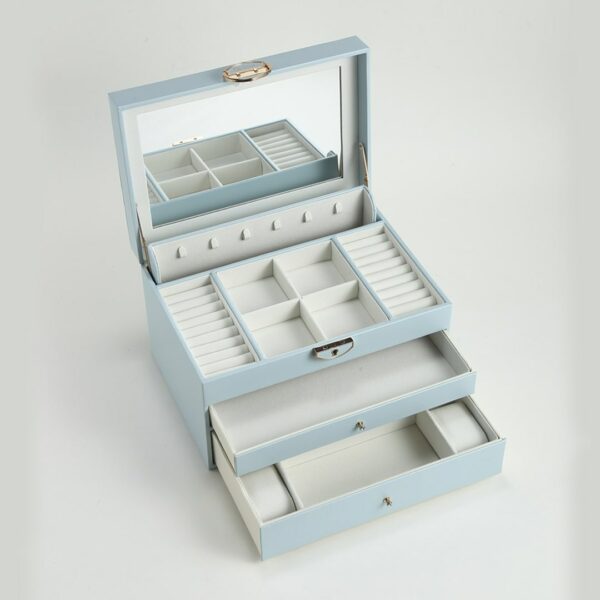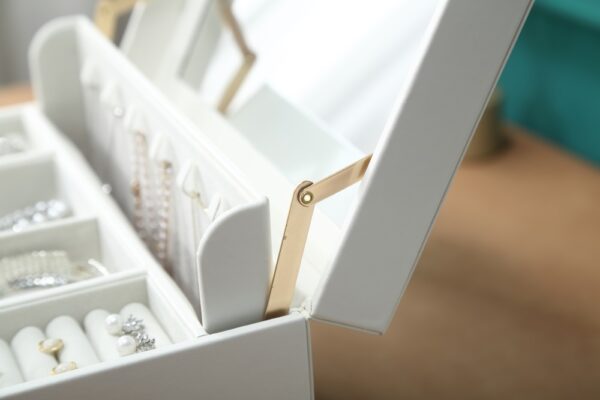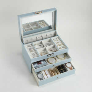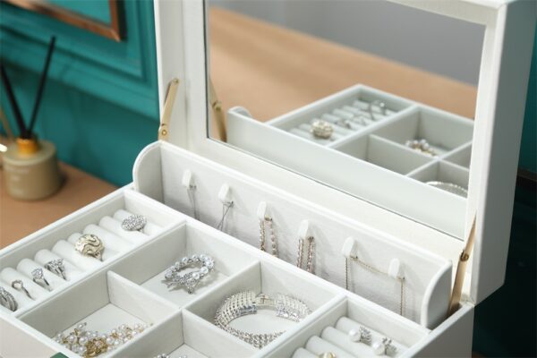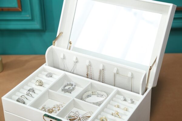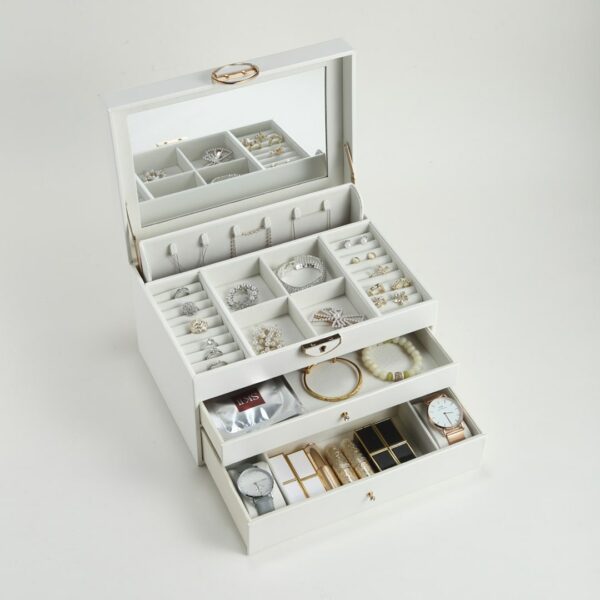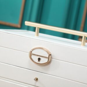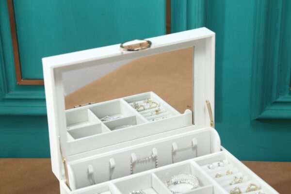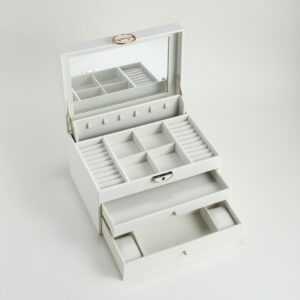 Kutija za nakit Fantasy nudi ti pregršt prostora za sve vrste nakita. Većih je dimenzija, sa tri odeljka za nakit i pravougaonim ogledalom ispod poklopca. Zbog elegantnog izgleda dobra je i za dekoraciju prostora.