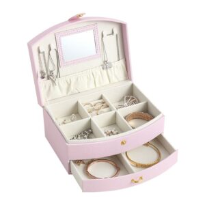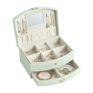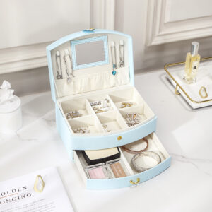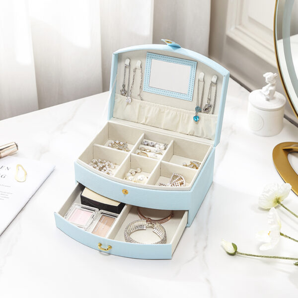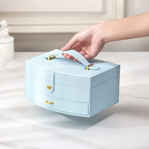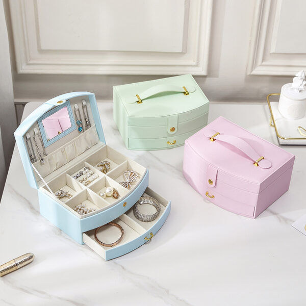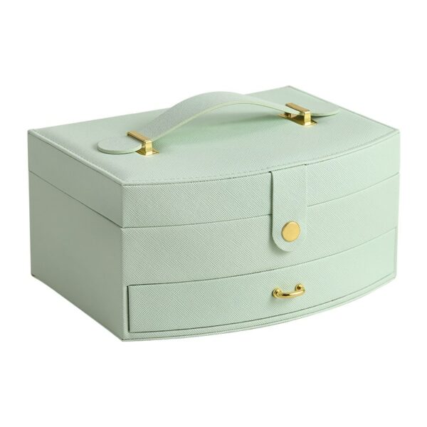 Kutija za ženski nakit od kože sa ručkom, u tri nežne, pastelne boje i sa elementima u boji zlata. Kutija sadrži dodatnu fioku i malo ogledalo ispod poklopca.