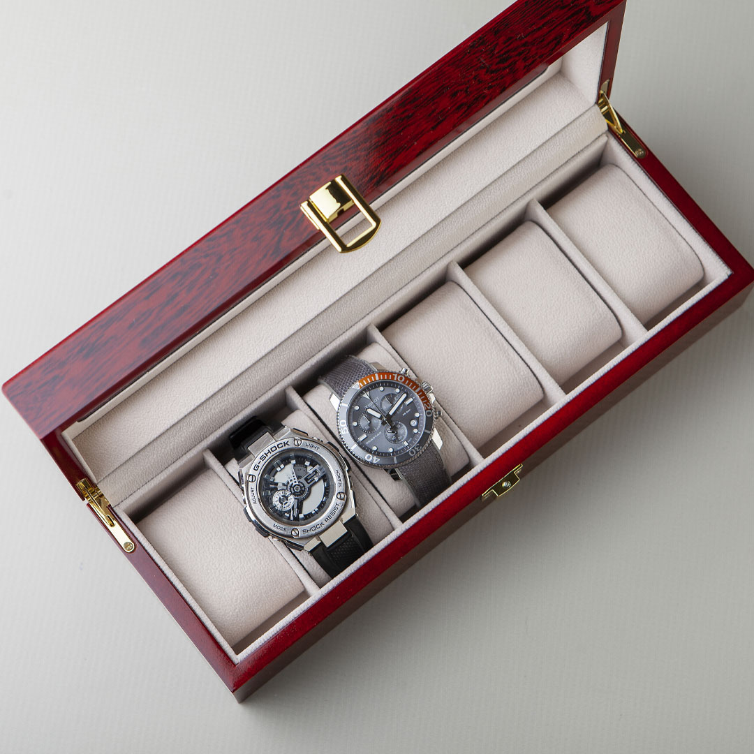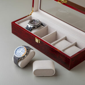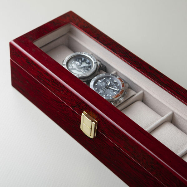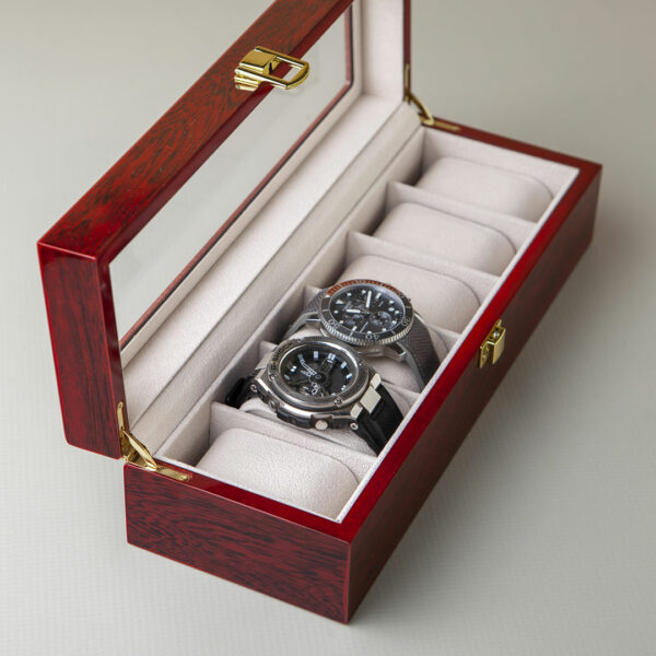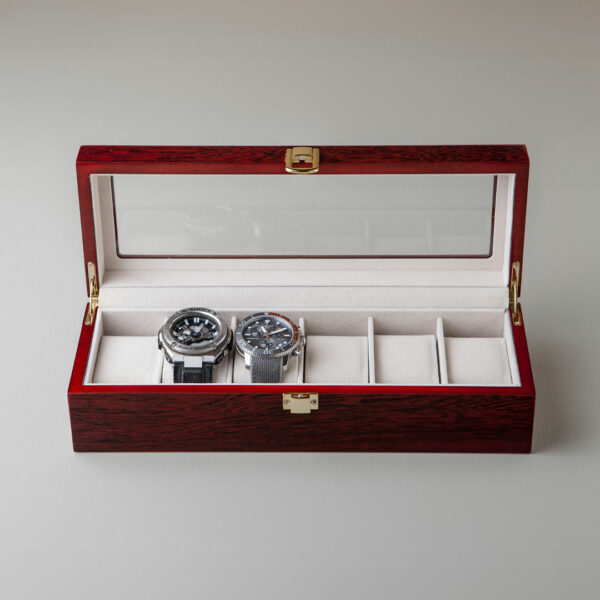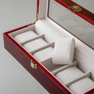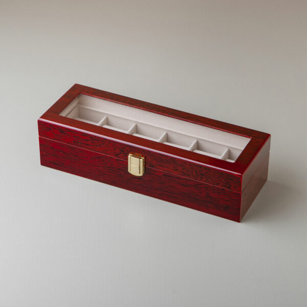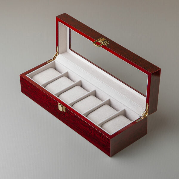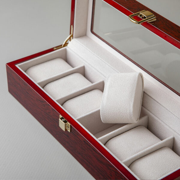 Kutija za satove 6 Ružino drvo se zatvara, tj. otvara uz pomoć metalne kopče u srebrnoj boji. Sa gornje strane kutije nalazi se otporno providno staklo, kako bi se kolekcija satova isticala. Unutrašnjost kutije presvučena je nežnim plišem koji sprečava nastanak ogrebotina na satovima. Jastučići se po potrebi mogu vaditi, tako da kutija može poslužiti i za manji broj ručnih satova.
