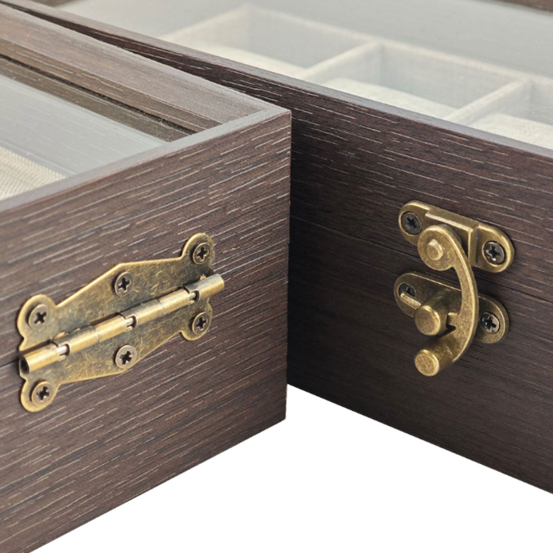 Ova kompaktna i elegantna drvena kutija za satove namenjena je čuvanju i organizaciji do 6 satova. Izrađena je od tamnijeg drveta koje u kombinaciji sa bronzanim detaljima daje klasičan i jako lep izgled.