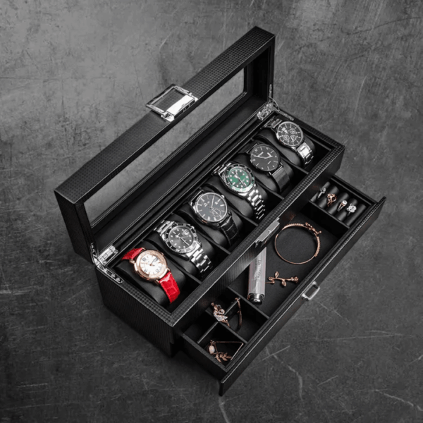 Kutija za satove i nakit Black 6 – 2 Nivoa – Idealan izbor za ličnu organizaciju ili kao poklon koji spaja stil i funkcionalnost.