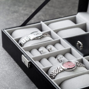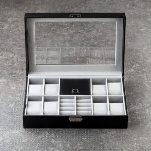 Kutija za satove + Nakit Budget je praktično i elegantno rešenje za čuvanje tvojih satova i nakita na jednom mestu. Unutrašnjost je podeljena u odvojene pregrade za satove i nakit, omogućavajući ti da organizuješ svoje dragocenosti na način na koji ti odgovara.