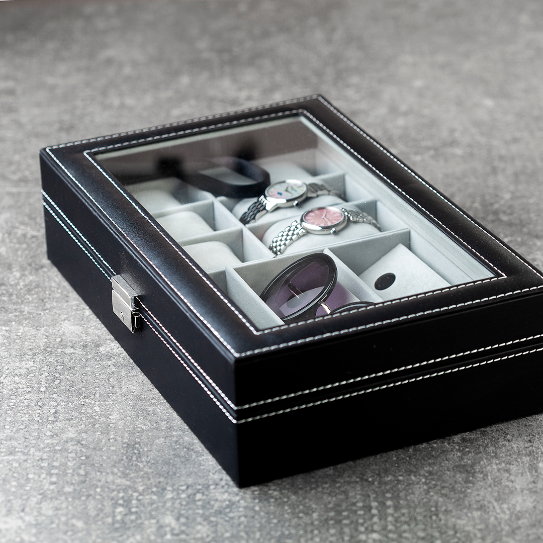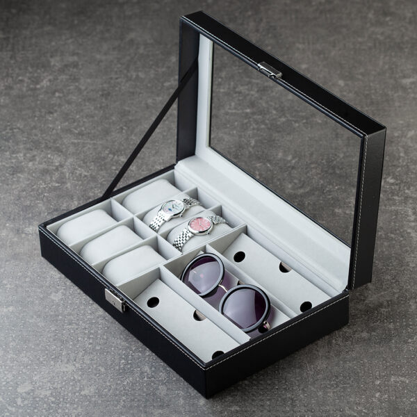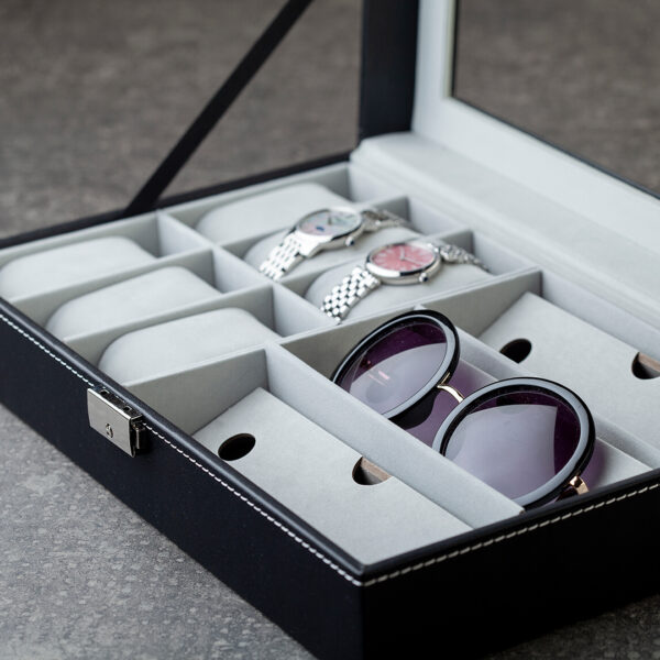 Unutrašnjost u svetlo sivoj boji obložena je mekim materijalom koji dodatno štiti satove i naočare, čineći ovu kutiju idealnim izborom za kućnu upotrebu, poklon ili organizaciju kolekcije aksesoara po pristupačnoj ceni.
