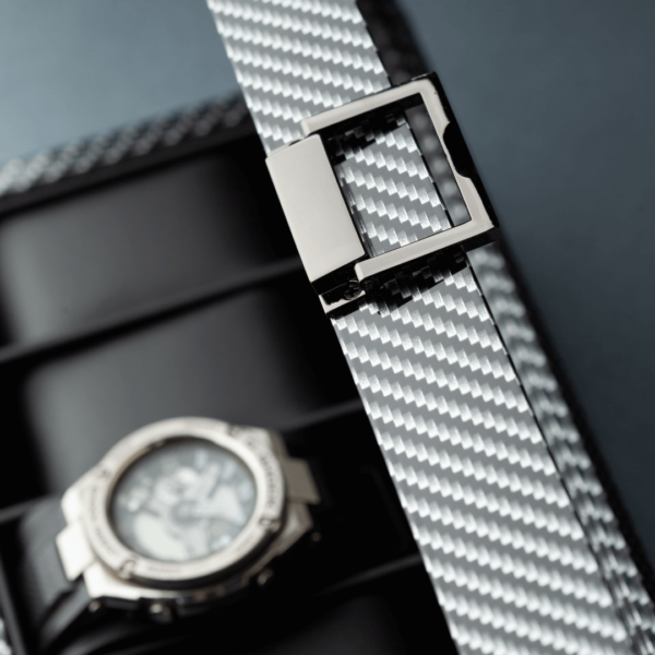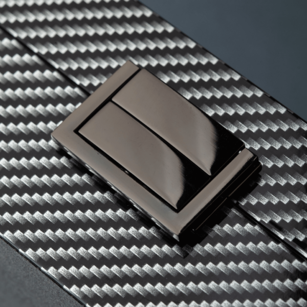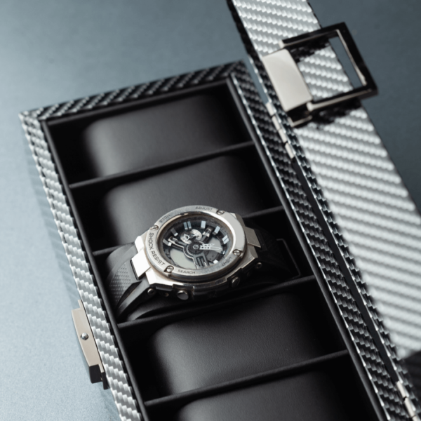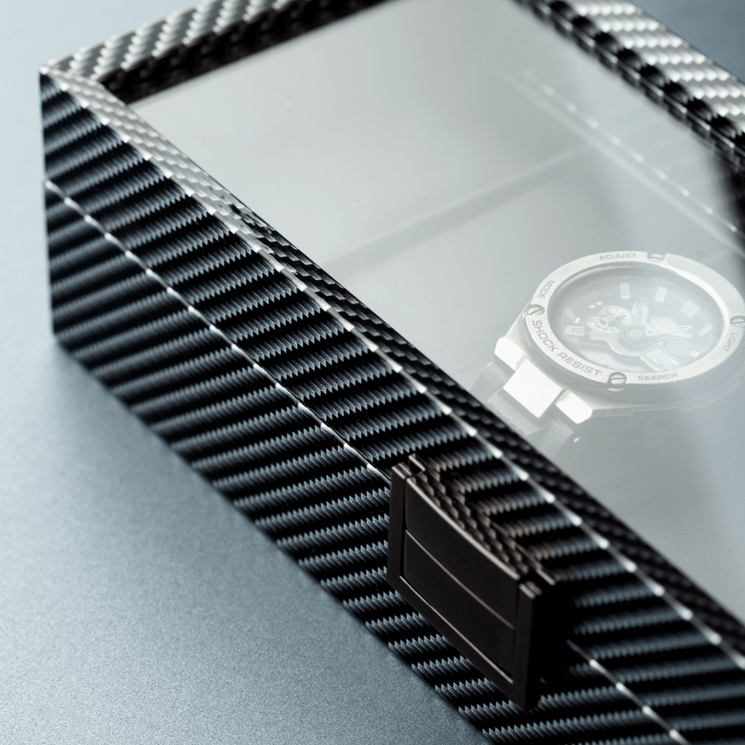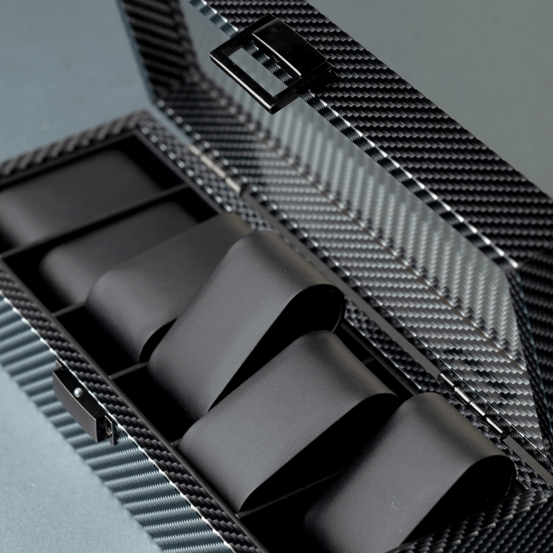 Kutija se zatvara, tj. otvara uz pomoć metalne kopče. Spoljašnjost je od karbona. Sa gornje strane kutije nalazi se otporno providno staklo, kako bi se kolekcija satova isticala. Unutrašnjost kutije presvučena je PU kožom koji sprečava nastanak ogrebotina na satovima. Jastučići se po potrebi mogu vaditi, tako da kutija može poslužiti i za manji broj ručnih satova.