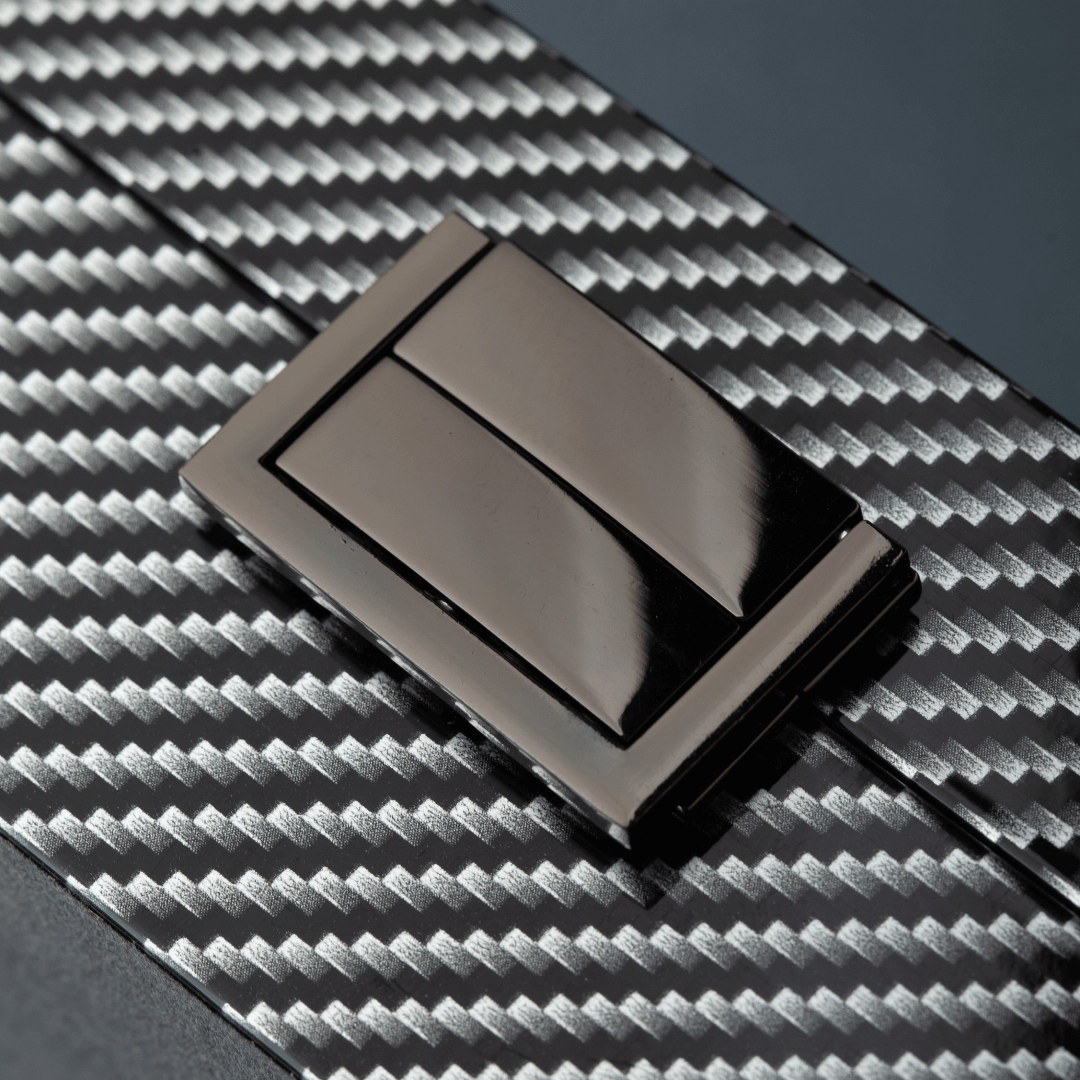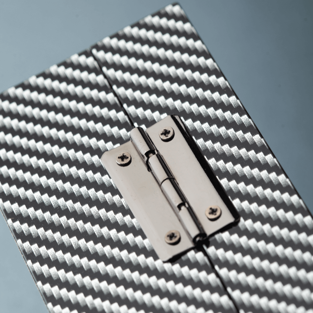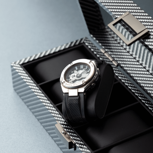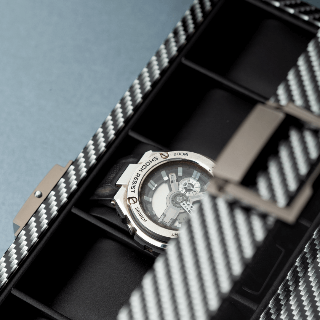 Kutija se zatvara, tj. otvara uz pomoć metalne kopče. Spoljašnjost je od karbona. Sa gornje strane kutije nalazi se otporno providno staklo, kako bi se kolekcija satova isticala. Unutrašnjost kutije presvučena je PU kožom koji sprečava nastanak ogrebotina na satovima. Jastučići se po potrebi mogu vaditi, tako da kutija može poslužiti i za manji broj ručnih satova.