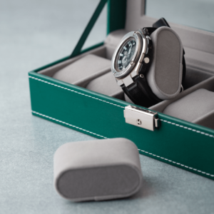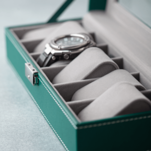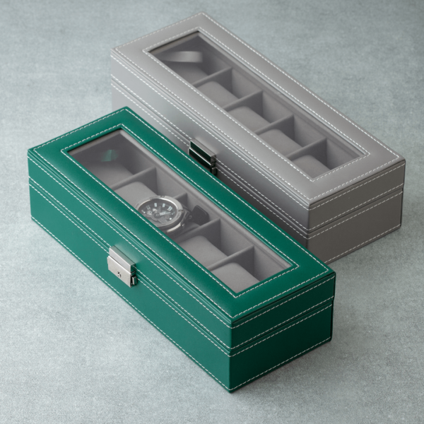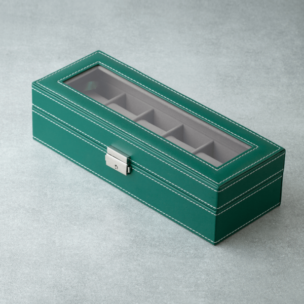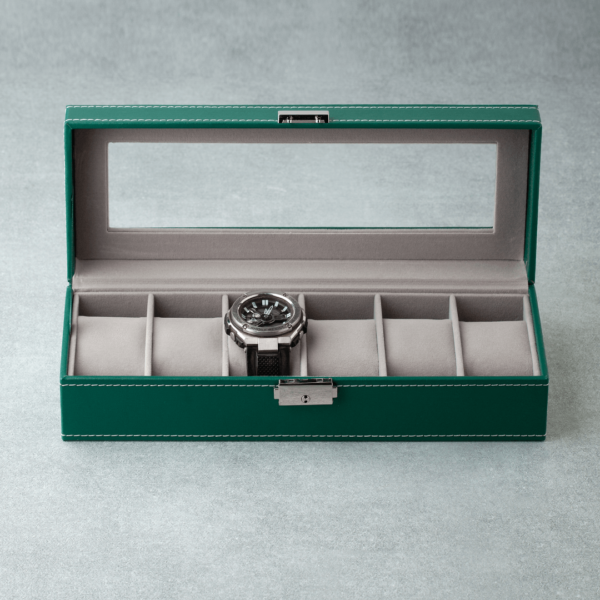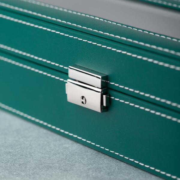 Kutija za satove Standard 6 spolja je obložena zelenom eko kožom, proštepanom belim koncem. Kutija se zatvara, odnosno otvara sa prednje strane, uz pomoć metalne kopče srebrne boje. Sa gornje strane kutija ima ,,prozor“ od stakla, koji Vam omogućava da uživate u pogledu na Vaše omiljene modne dodatke. Unutrašnjost kutije za satove obložena je svetlim i mekim materijalom koji će sprečiti nastanak ogrebotina na satovima. U kutiji se nalazi ukupno 6 jastučića za ručne satove, koji se po potrebi mogu vaditi.