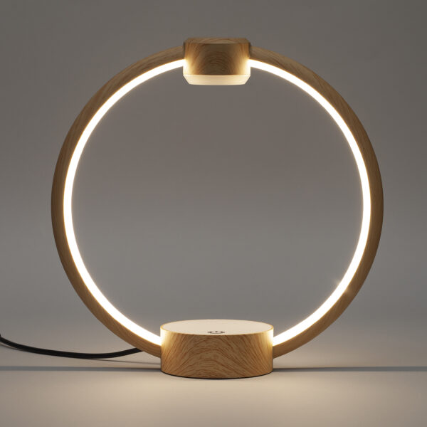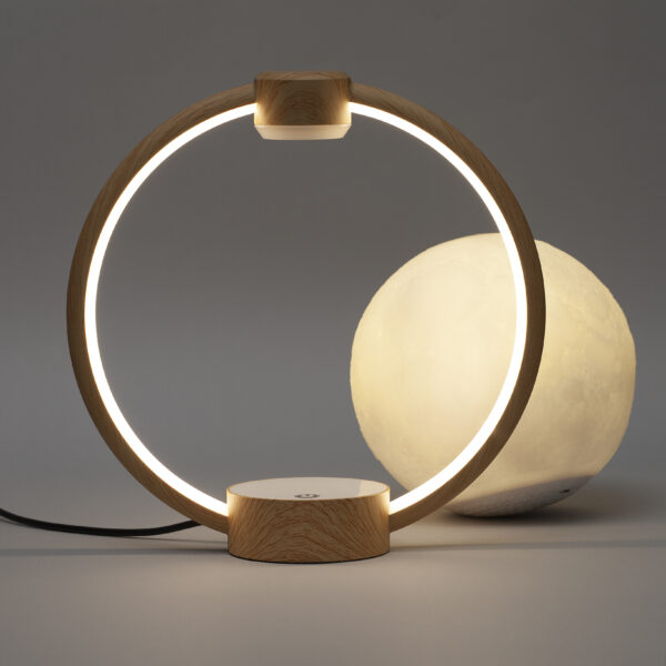 Efekat levitacije postignut je uz pomoć jakog magnetnog polja. Postolje lampe je drveno, kao i okvir koji može poslužiti i kao nosač.