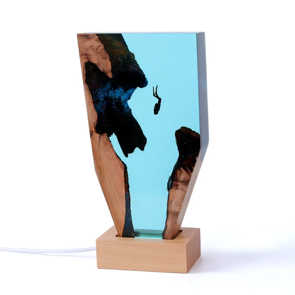 Lampa Ronilac Premium napravljena je tako da stvara 3D efekat stenovitog morskog dna u kom se kriju ronilac i grbavi kit. Morsku vodu imitira plava epoksi smola, a stene posebno obrađeno drvo. Lampa ima LED svetla koja se odlikuju dugotrajnošću.