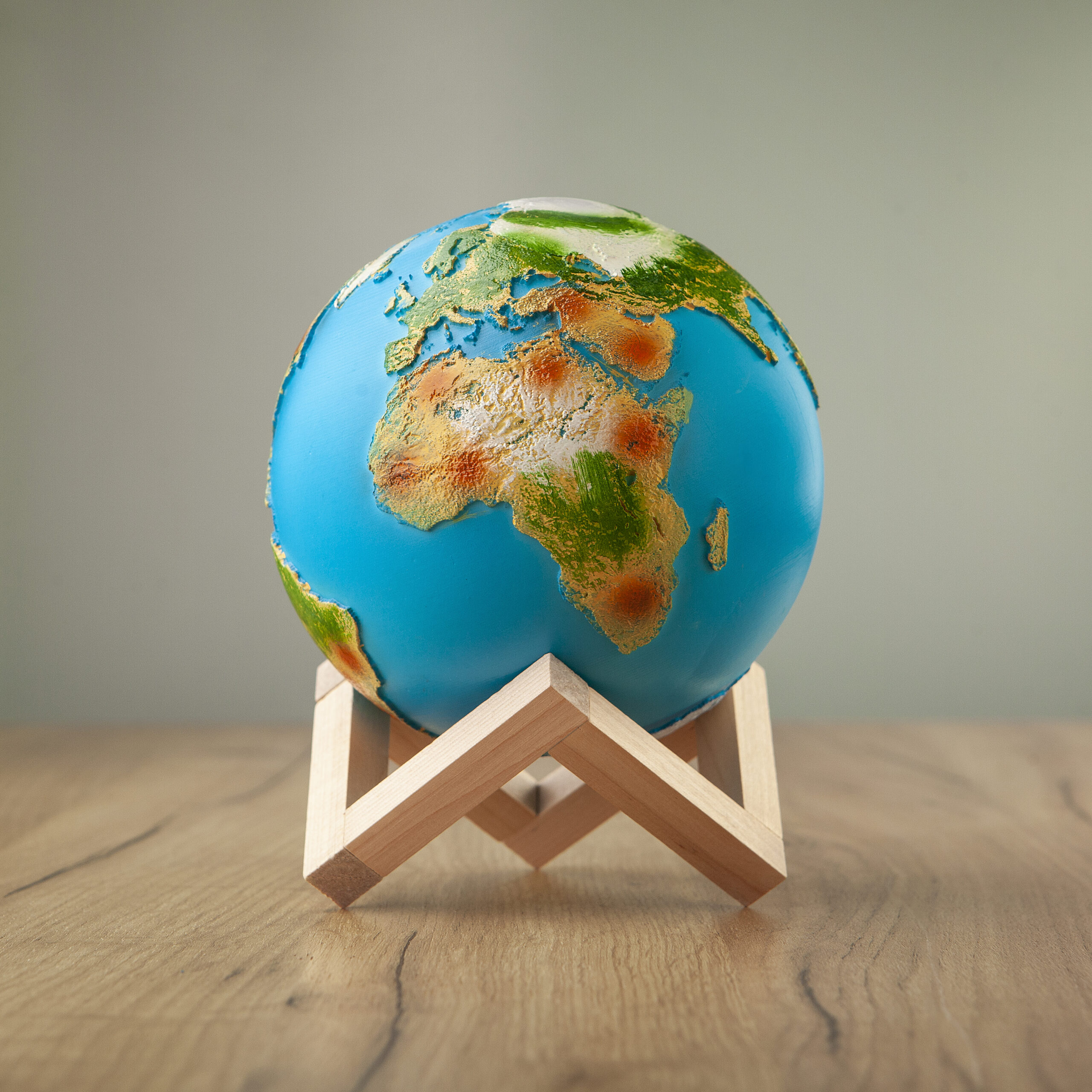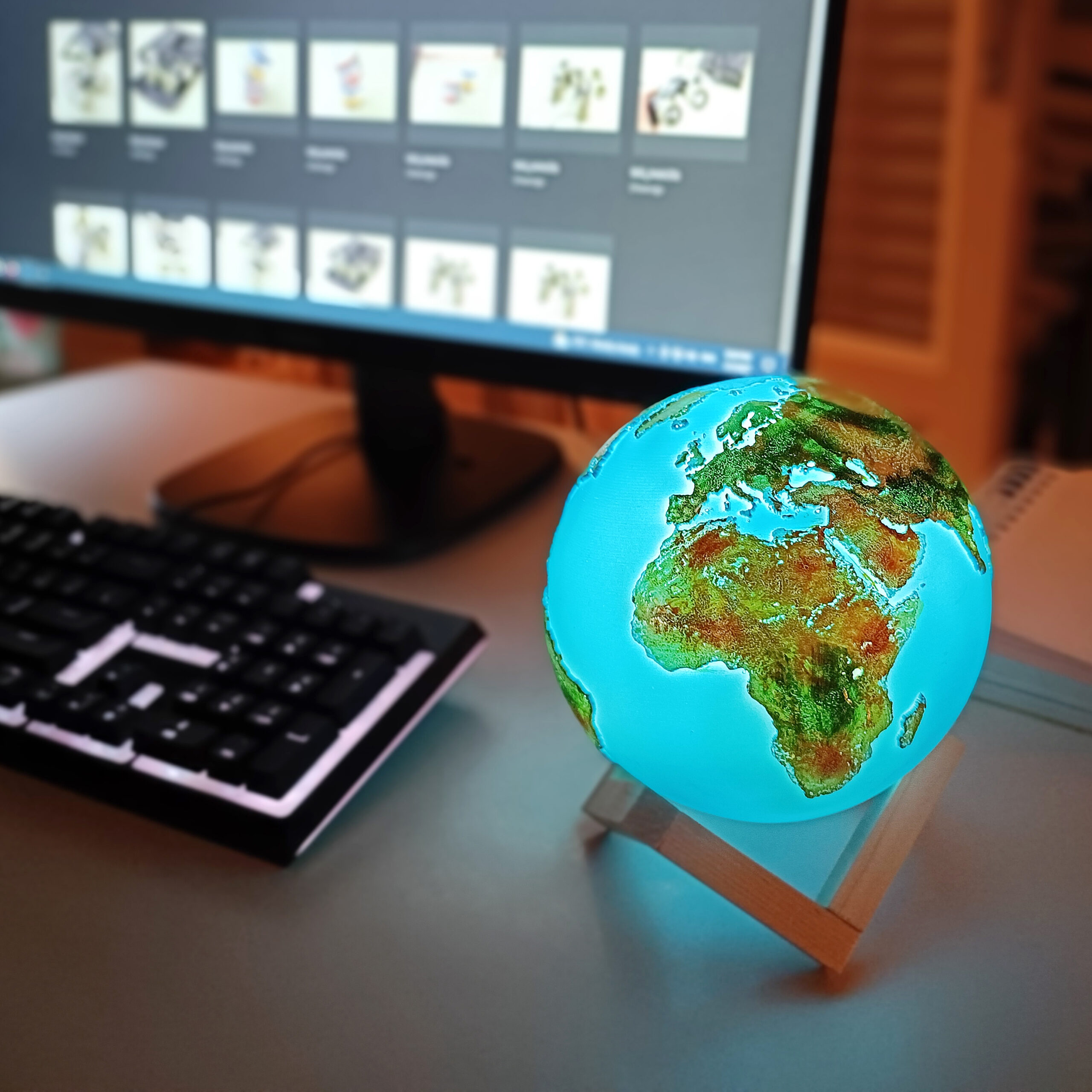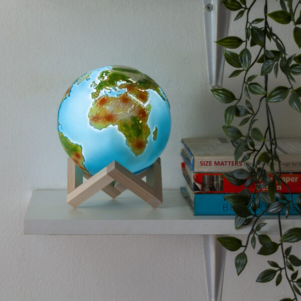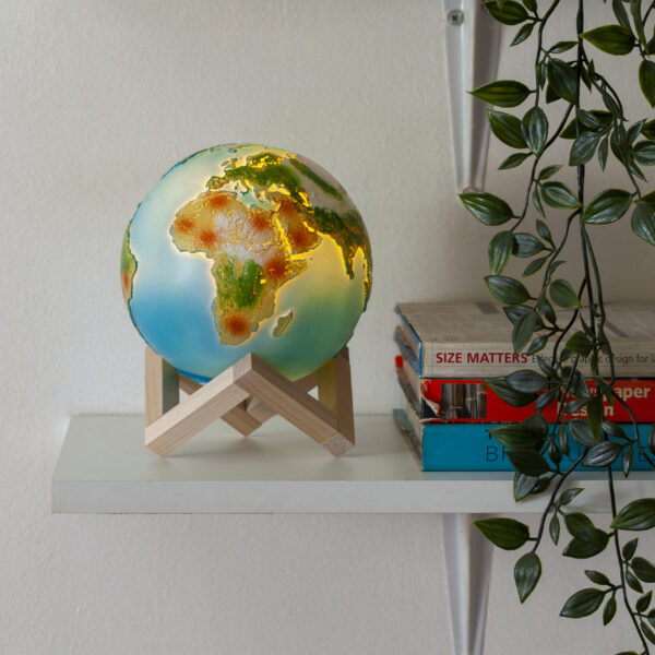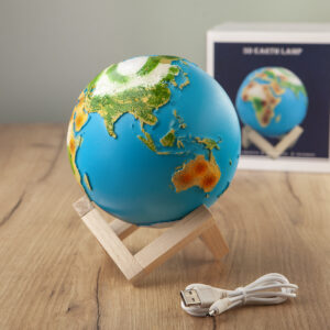 Našu plavu planetu ne moramo da gledamo samo kroz objektiv satelita. Verni 3D prikaz Zemlje pružiće ti ova lampa. Tu je naravno i uživanje u prijatnoj i blagoj svetlosti koja se može po želji lako prilagođavati. 3D model Zemlje postavljen je na četvrtasto drveno postolje. Površina lampe Zemlje je neravna i na njoj su realistično prikazani svi kontinenti sa odgovarajućim bojama reljefa. Punjenje lampe je na ulazu sa donje strane, putem USB kabla.