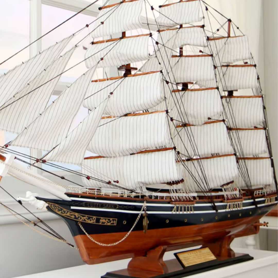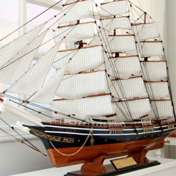 Maketa broda Cutty Sark je verna replika jednog od najbržih clippera 19. veka, koji je postao simbol pomorskih trka i trgovine. Izgrađen 1869. godine, Cutty Sark je bio poznat po svojoj izuzetnoj brzini i elegantnom dizajnu, a koristio se za transport čaja i vune između Britanije i Istočne Azije. Danas je Cutty Sark muzejski brod u Londonu, i simbol britanske pomorske moći. Ova maketa pažljivo prikazuje sve karakteristike broda, uključujući prelepa jedra i detaljno dizajnirane jarbole, čineći je idealnim komadom za kolekcionare i ljubitelje pomorske tradicije.