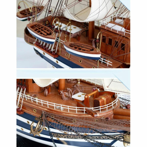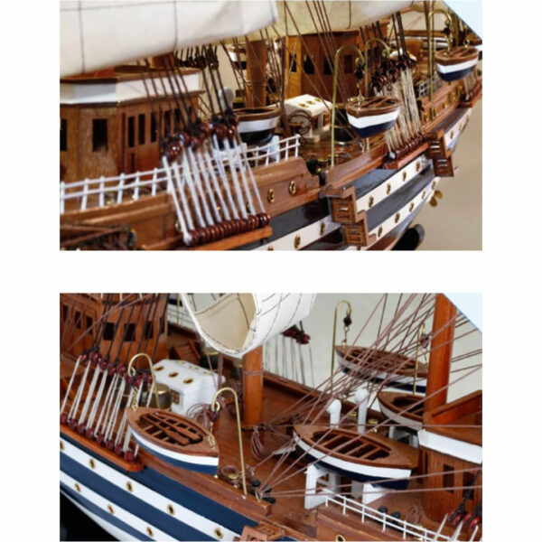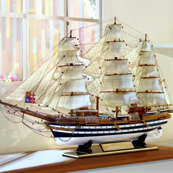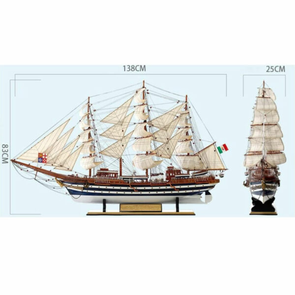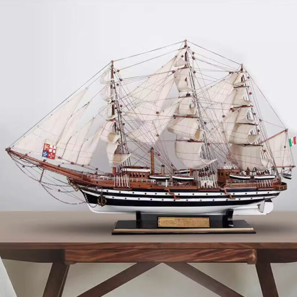 Maketa broda Amerigo Vespucci predstavlja vernu repliku ovog legendarnog broda, koji je postao simbol italijanske pomorske tradicije. Izgrađen 1931. godine, Vespucci je i danas aktivan kao školski brod italijanske mornarice, poznat po svojim impozantnim jedrima i klasičnom dizajnu. Brod je nazvan po slavnom istraživaču Amerigu Vespucciju, a tokom svojih plovidbi, koristi se za obuku novih generacija pomoraca. Ova maketa detaljno prikazuje prelep dizajn broda, sa bogatim ukrasima i pažljivim rukopisom svakog detalja, što je čini savršenim komadom za ljubitelje pomorske istorije.