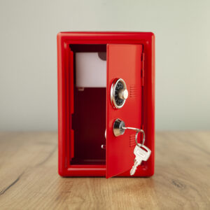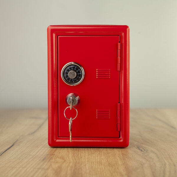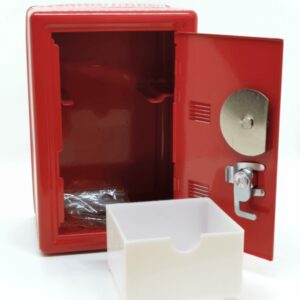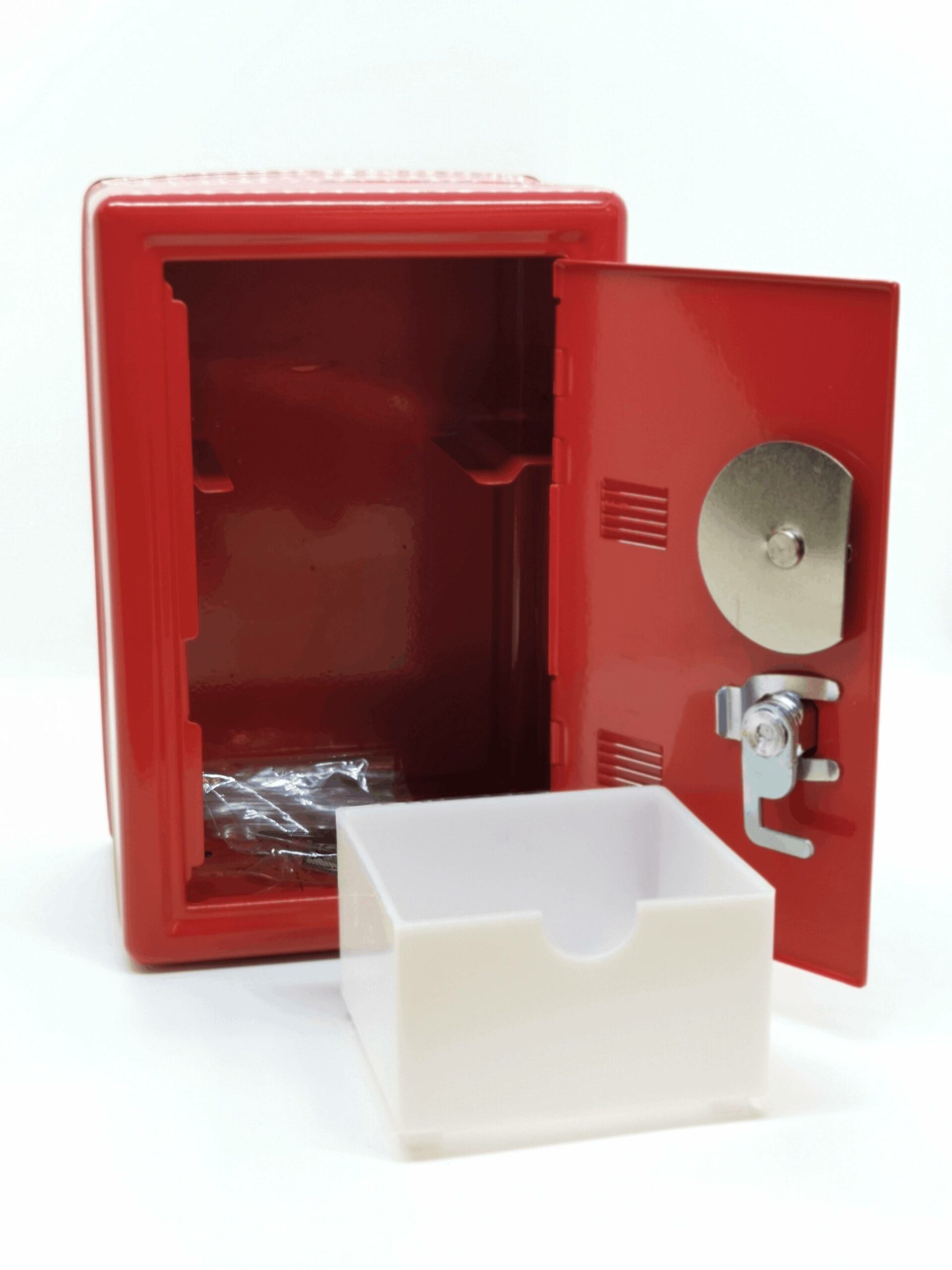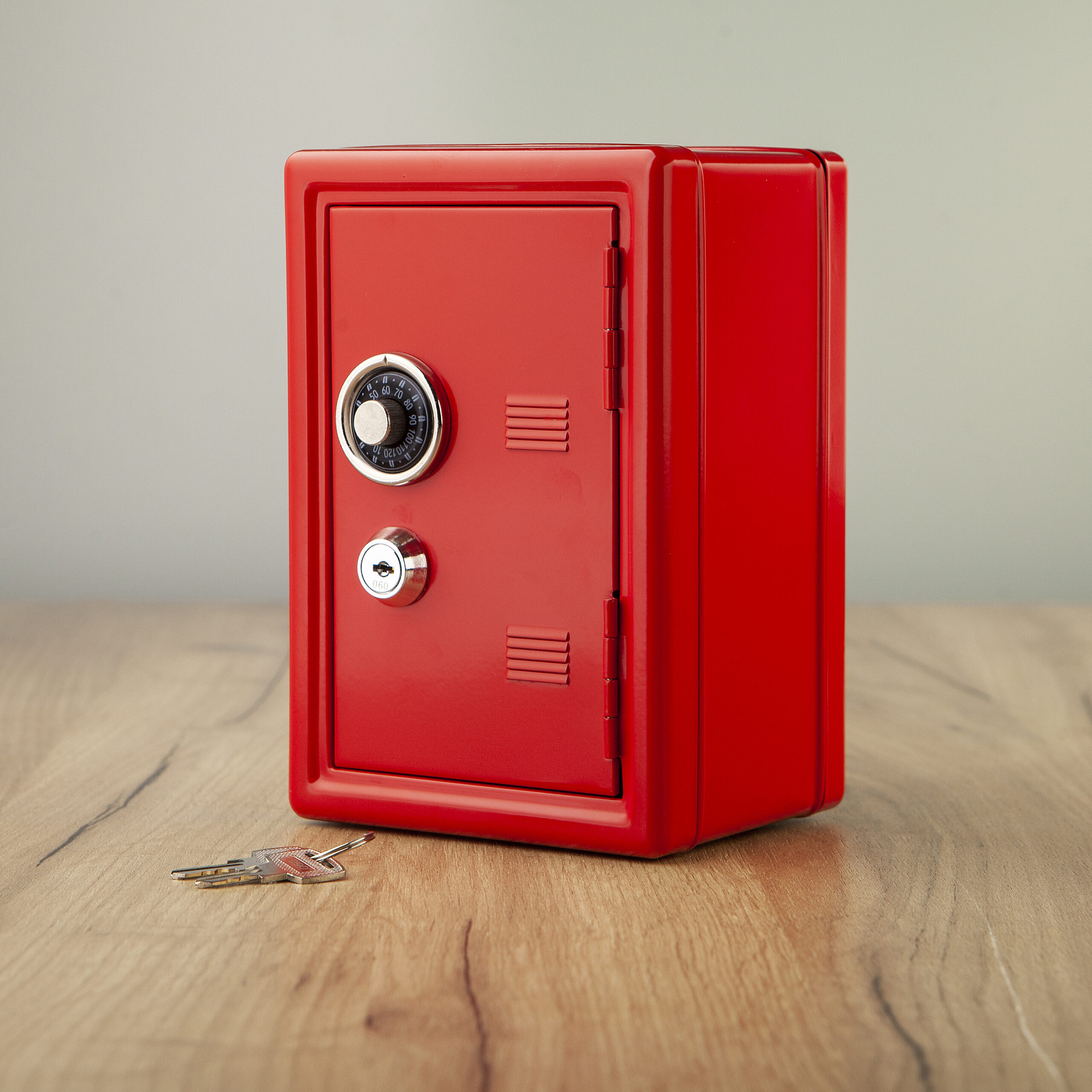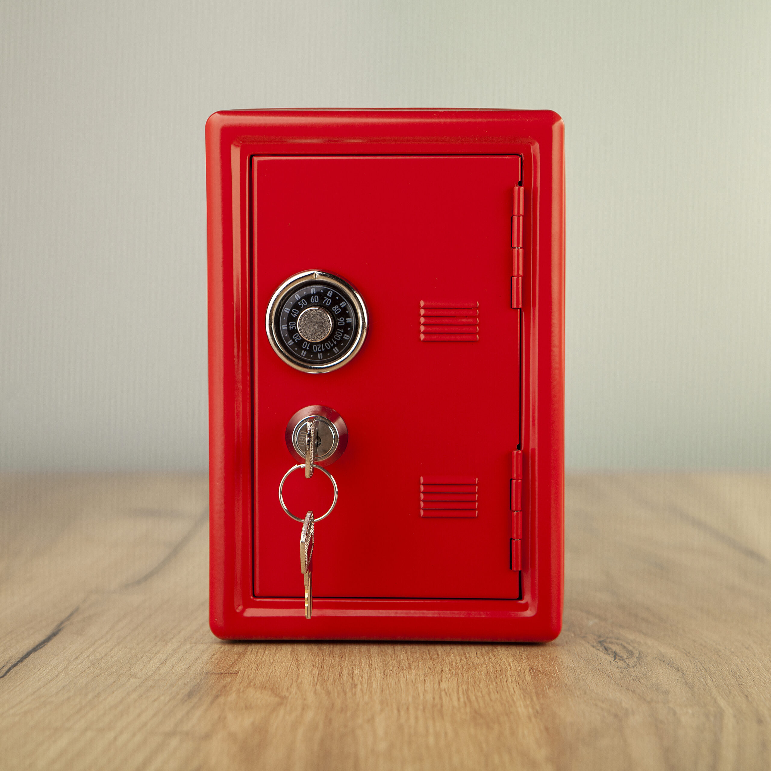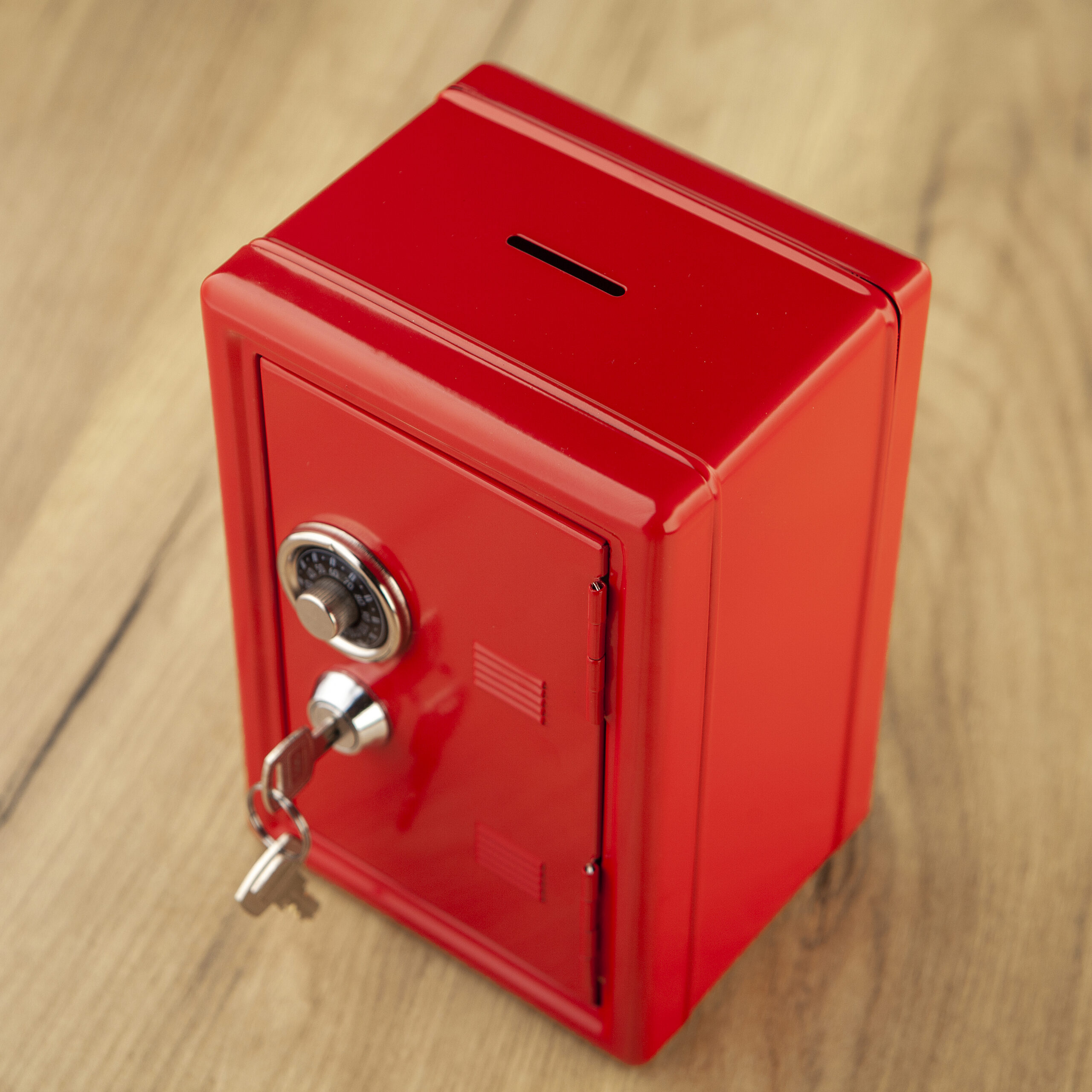 Metalni sef kasica koji može da se zaključa. Možete upotrebiti šifru a možete ga zaključati ključem. U ponudi su crveni, plavi i crni.
