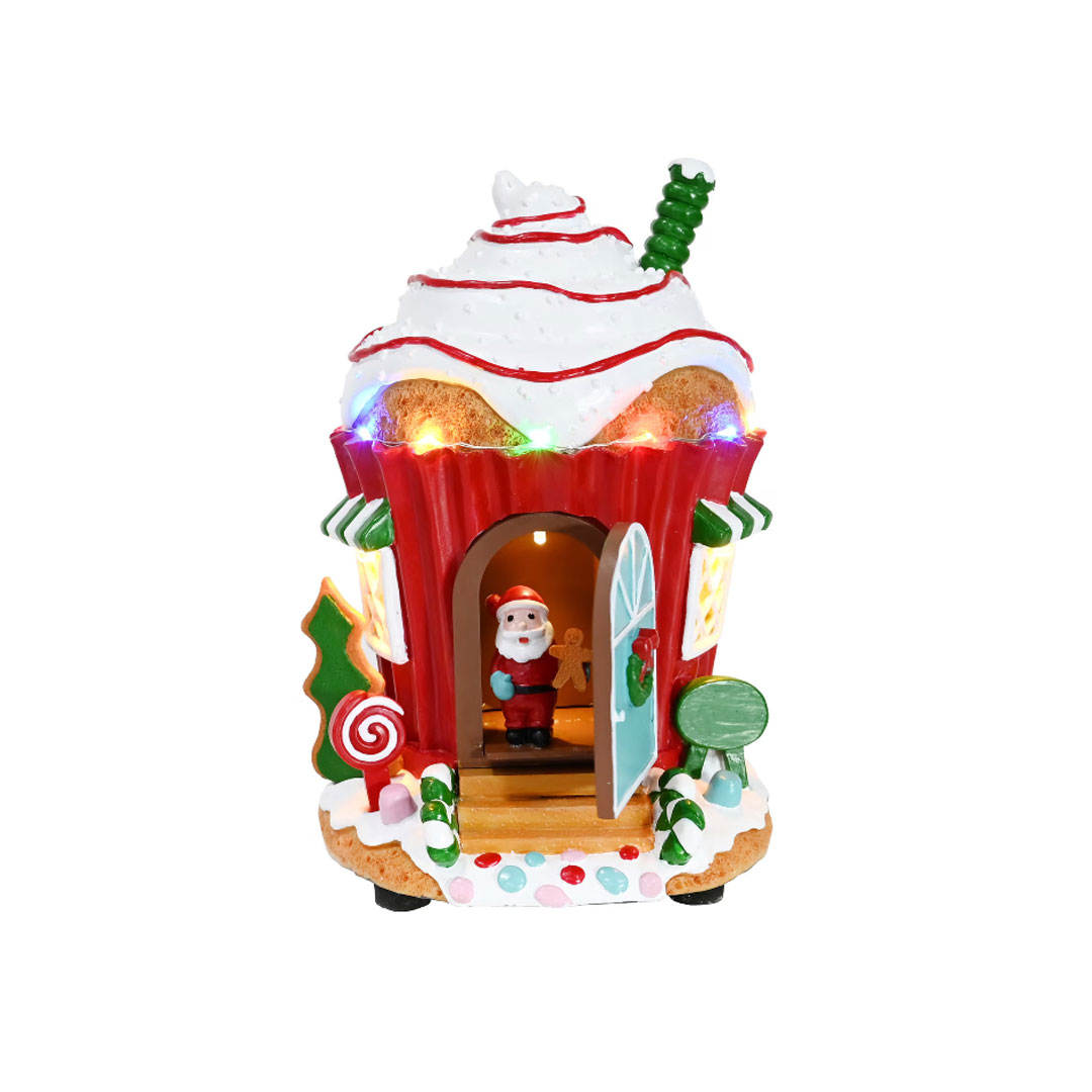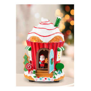 Ovaj čarobni novogodišnji ukras prikazuje Kuću Deda Mraza sa LED lampicama koje svetle i stvaraju prazničnu atmosferu. Sladak Deda Mraz otvara vrata i izlazi napolje i vraća se unutra , unoseći veselje i magiju u svaki prostor.