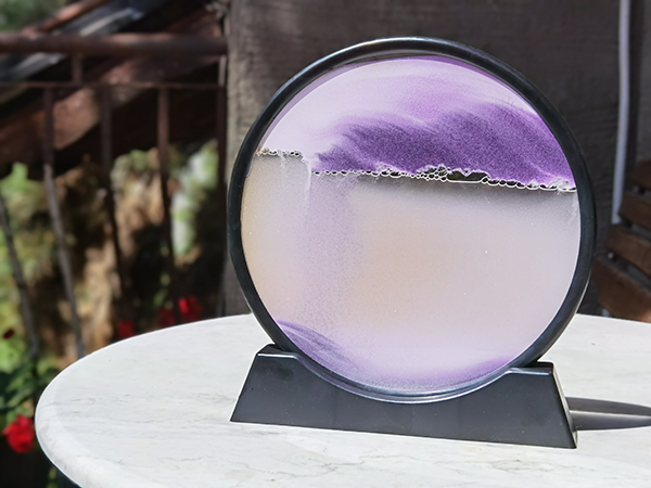 Pesak i tečnost zarobljeni u staklo zabaviće te i opustiti, a pritom i ukrasiti omiljeni kutak tvoje prostorije. Zajedno sa postoljem čine jedinstvenu sliku, čiji prizor se menja kad ti to poželiš. Okruglo staklo prečnika je 26cm. Pesak unutar stakla je u boji, dok je tečnost prozirna. Prilikom pomeranja stakla pesak se polako pomera i tako formira uvek drugačije oblike. Pogled na peščanu sliku pruža osećaj mira i opuštenosti. Zbog ovog efekta peščana slika je idealna dekoracija za radni sto. U ponudi Ekspedicije postoji i peščana slika manjih dimenzija.