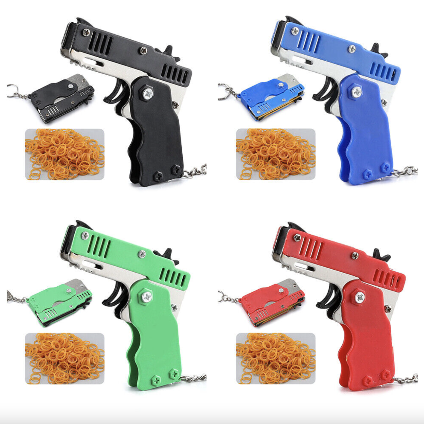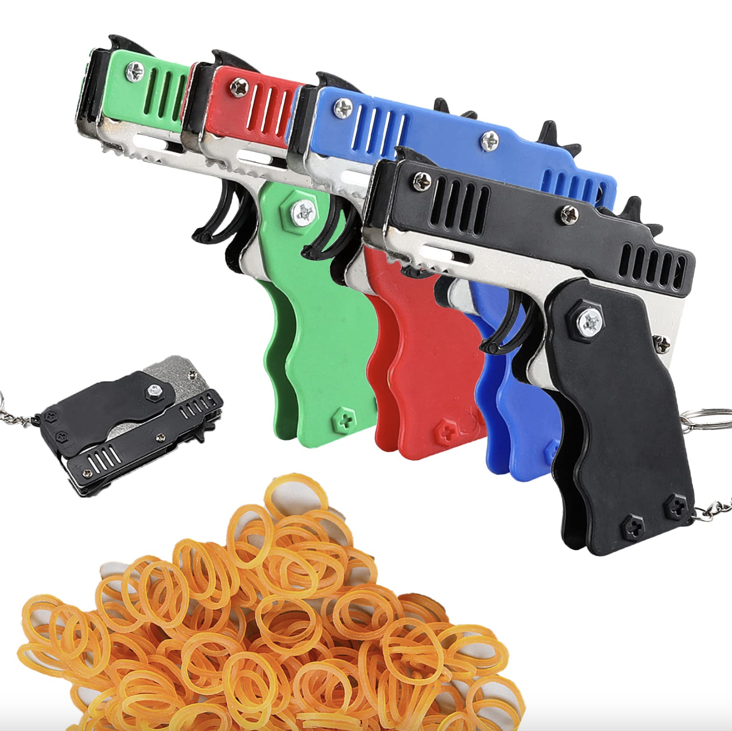 Najjednostavniji i najbezazleniji oblik pištolja jeste onaj na gumice. On ti pomaže da vežbaš preciznost u gađanju. Njime ne možeš nikoga da povrediš a zbog njegovih dimenzija i veličine zasigurno ćeš uvežbati precizno gađanje. U tome ti pomaže i mala plastična meta. Ovaj pištolj na gumice je mala stvarčica koja ti pomaže da usavršiš svoje veštine gađanja. U setu dolazi i pakovanje gumica a pištolj se prodaje u plavoj ili crvenoj boji.