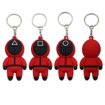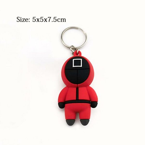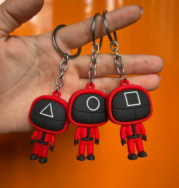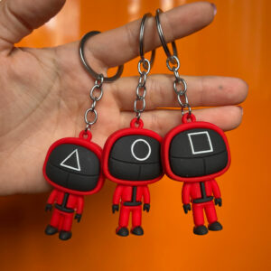 Privezak Squid game Najveći fanovi serije Squid Game prepoznaće se po ovom detalju. U pitanju je meki privezak sa 3D verzijom čovečuljka i poznatim logotipima iz serije. Privezak je izrađen od meke, kvalitetne gume, u kombinaciji crne i crvene boje. Kratkim lancem privezak je povezan sa metalnim podesivim prstenom. U ponudi su tri verzije Squid Game privezaka- sa trouglom, kvadratom i krugom. Elementi su bele boje, na mestu lica figurice.