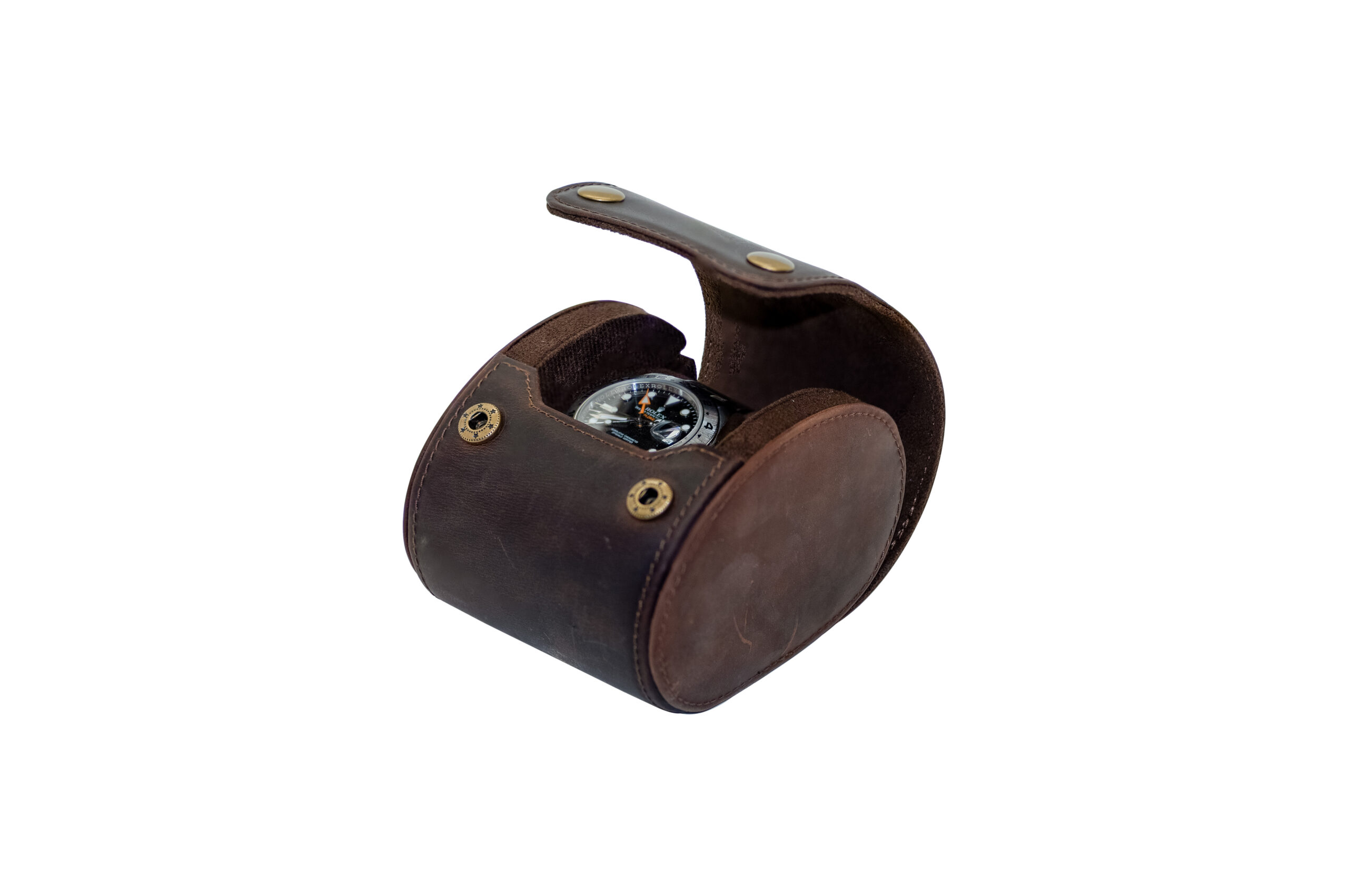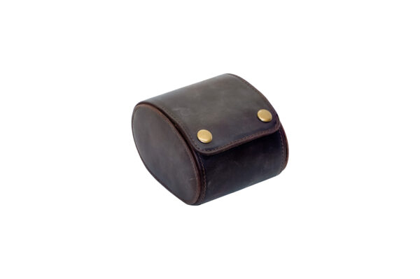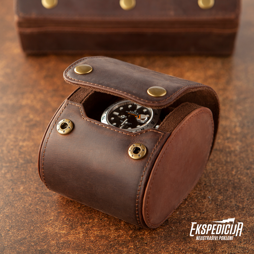 Elegantna koliko i tvoj omiljeni ručni sat, laka i praktična, ova kutija biće i te kako koristan saputnik na tvojim putovanjima. Dizajnirana je da u potpunosti zaštiti sat od oštećenja. Bilo koji sat može se smestiti na čvrstu tubu u unutrašnjosti kutije, obloženu mekim, smeđim materijalom. Spolja je kutija obložena glatkom kožom tamne boje. Zatvaranje, odnosno otvaranje kutije je sa prednje strane, uz pomoć dva drikera boje starog zlata.