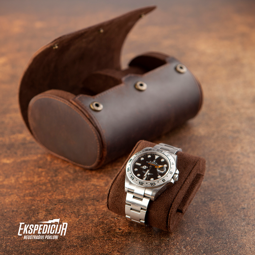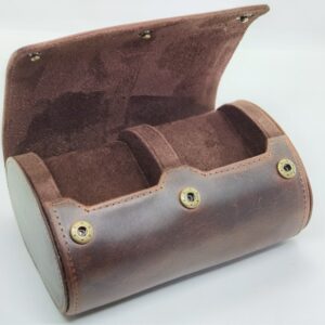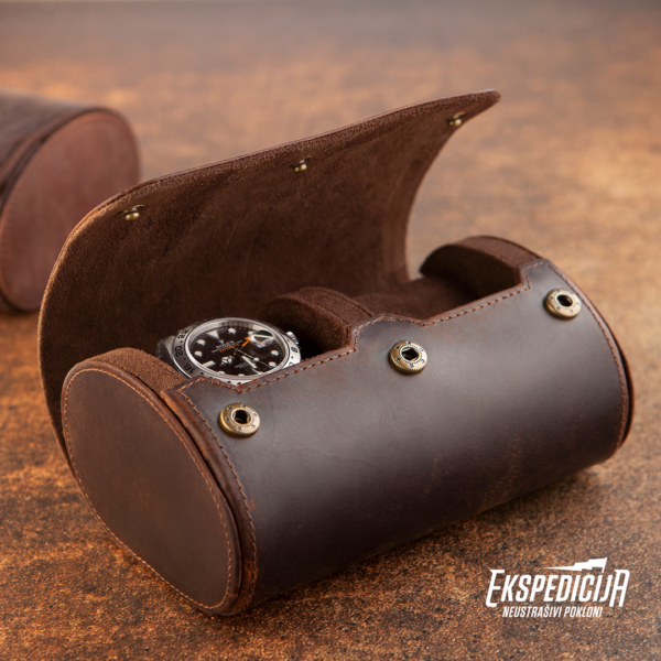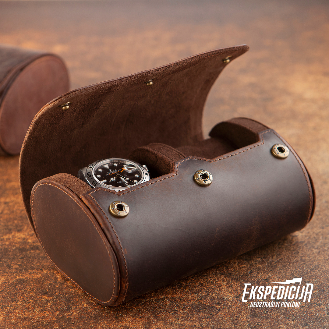 Kada imaš putnu kutiju za satove ne moraš da praviš težak izbor kog odabrati i poneti na putovanje. U ovu kutiju staju dva sata, nezavisno od vrste i širine narukvice, kao ni mehanizma. Satovi se smeste na čvrste tube, koje sprečavaju njihovo pomeranje i time potencijalna oštećenja. Unutrašnjost kutije obložena je mekim smeđim materijalom, a spoljašnjost kvalitetnom kožom tamne boje. Kutija se zatvara sa prednje strane, uz pomoć tri metalna drikera u boji starog zlata. Pored toga što je korisna, kutija je i elegantnog izgleda i zato odličan poklon!