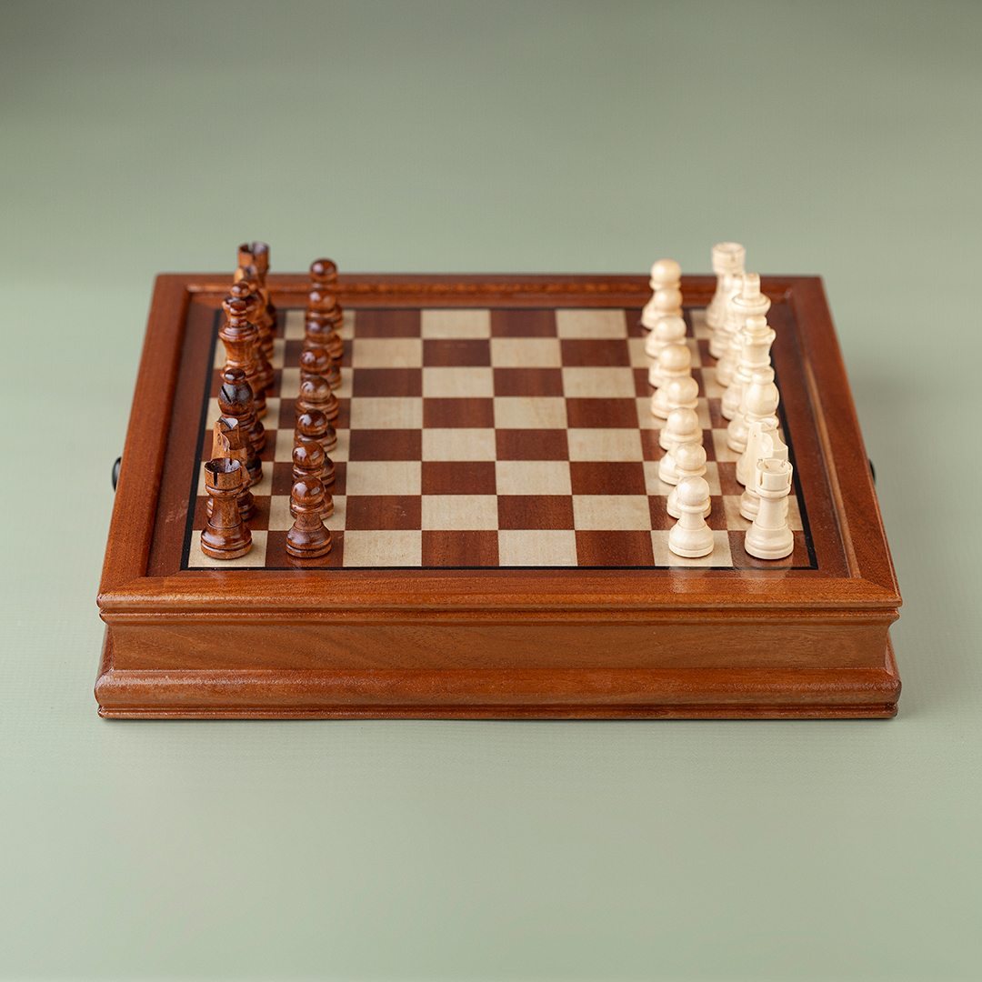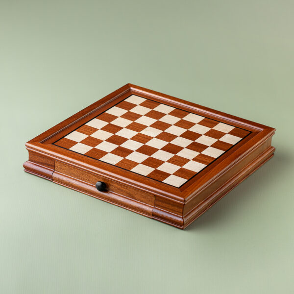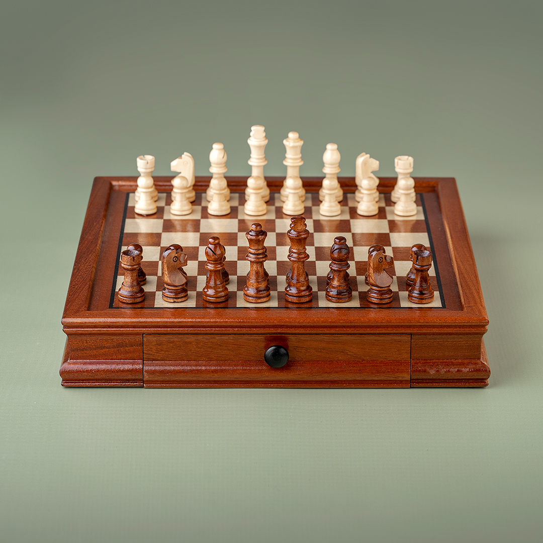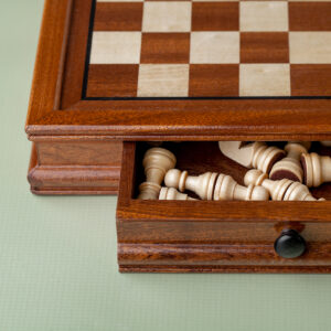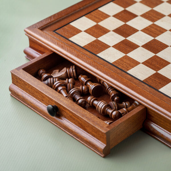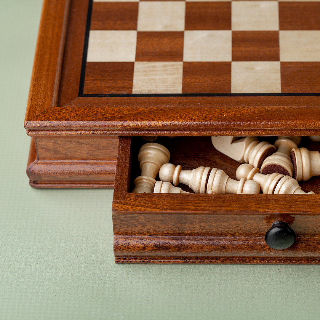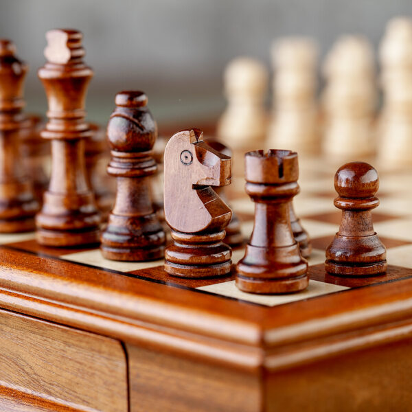 Drveni šah s magnetima, plišanim dnom i fiokom za praktično čuvanje figurica.