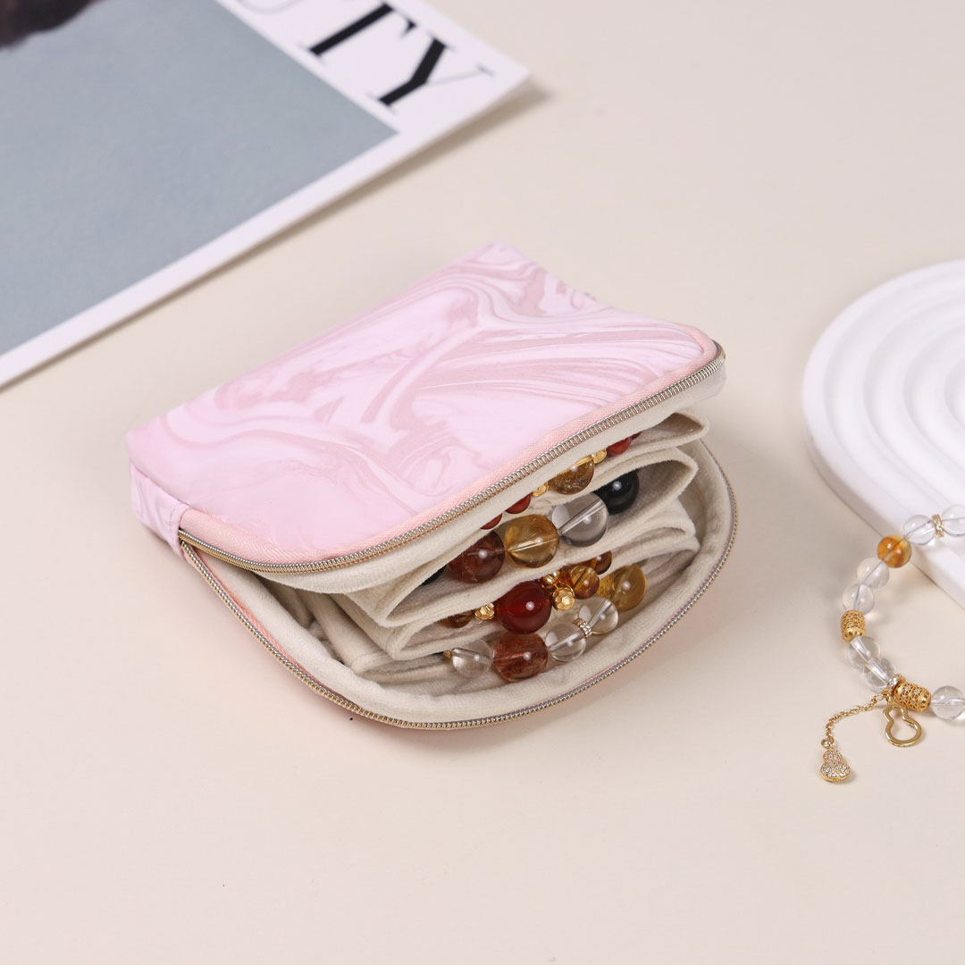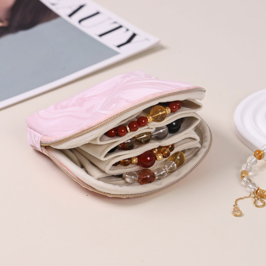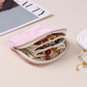 Ova putna torbica za nakit savršen je izbor za sigurno i uredno čuvanje omiljenih komada nakita tokom putovanja. Spoljašnost je izrađena od nežnog satenskog materijala, dok je unutrašnjost obložena mekanim plišem koji štiti nakit od grebanja. Unutar torbice se nalaze mekane pregrade, a ceo unutrašnji deo može da se lako izvadi, što dodatno olakšava organizaciju i upotrebu.