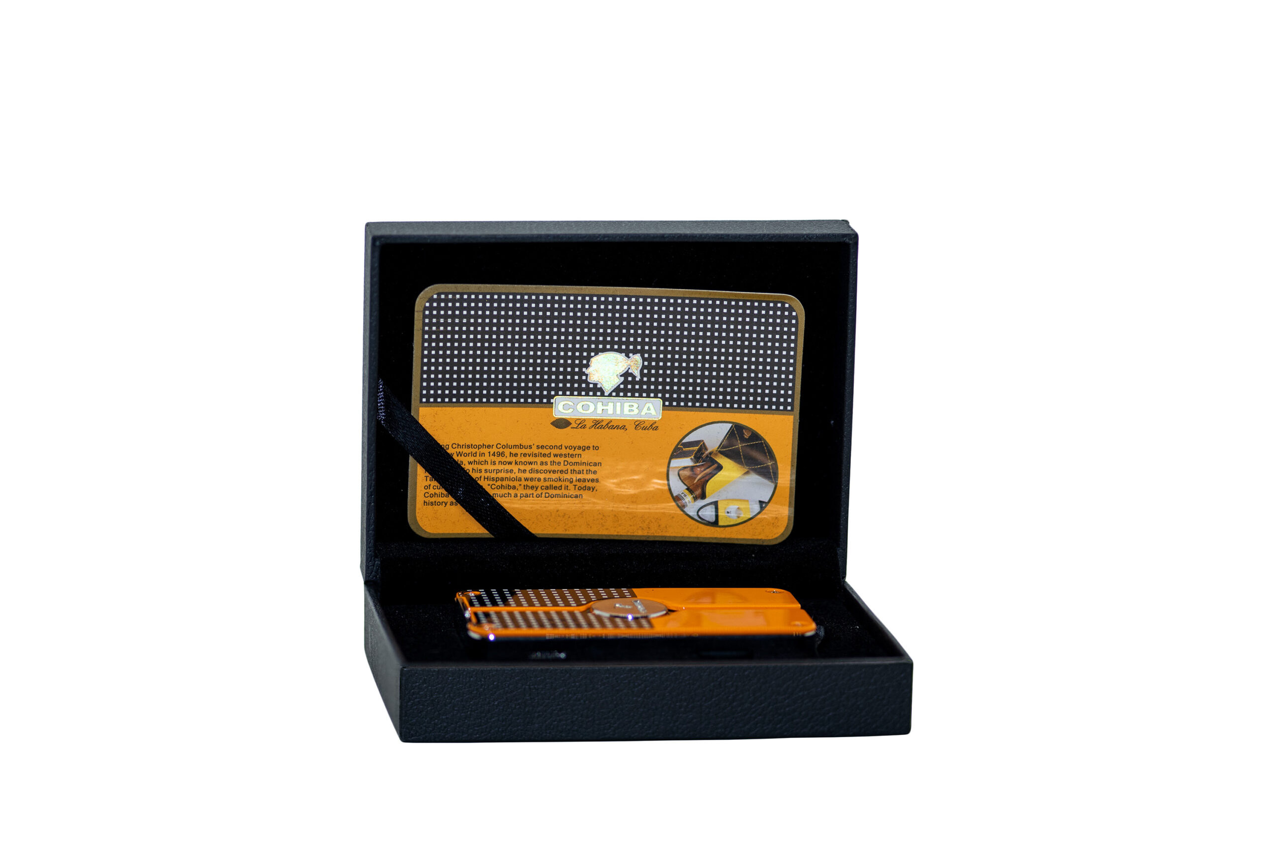 Originalni Cohiba brener poseduje tri dizne koje osiguravaju postojan plamen za tvoje omiljene duvanske proizvode. Ima oblik kutije za šibice i veoma je lak za koriščenje, kao i dopunu gasa. Poseduje i mogućnost podešavanja intenziteta plamena, kao i indikator nivoa gasa. Logo brenda Cohiba zauzima centralno mesto, u metalnom krugu. Upaljač je dostupan u dve boje- crnoj i žutoj i dolazi u originalnoj kutiji.