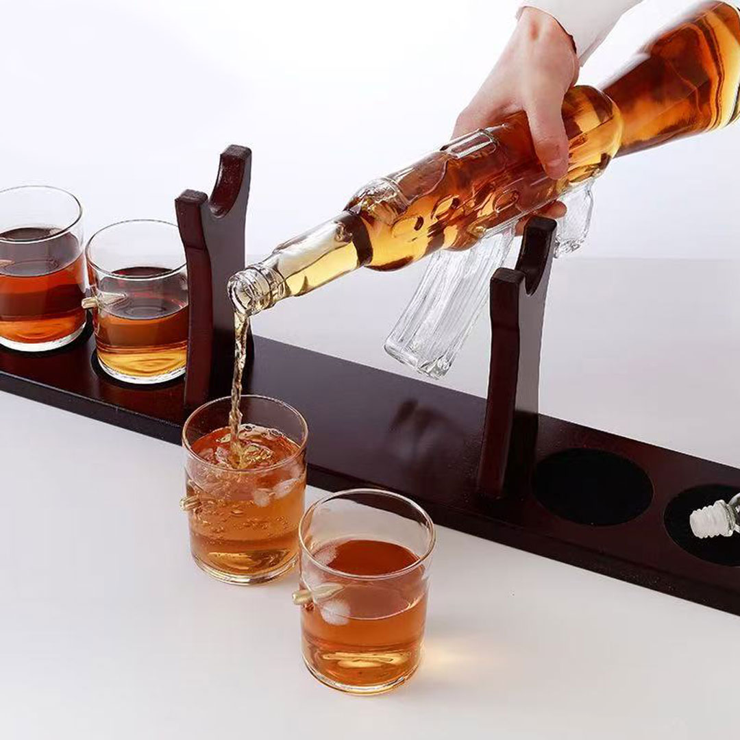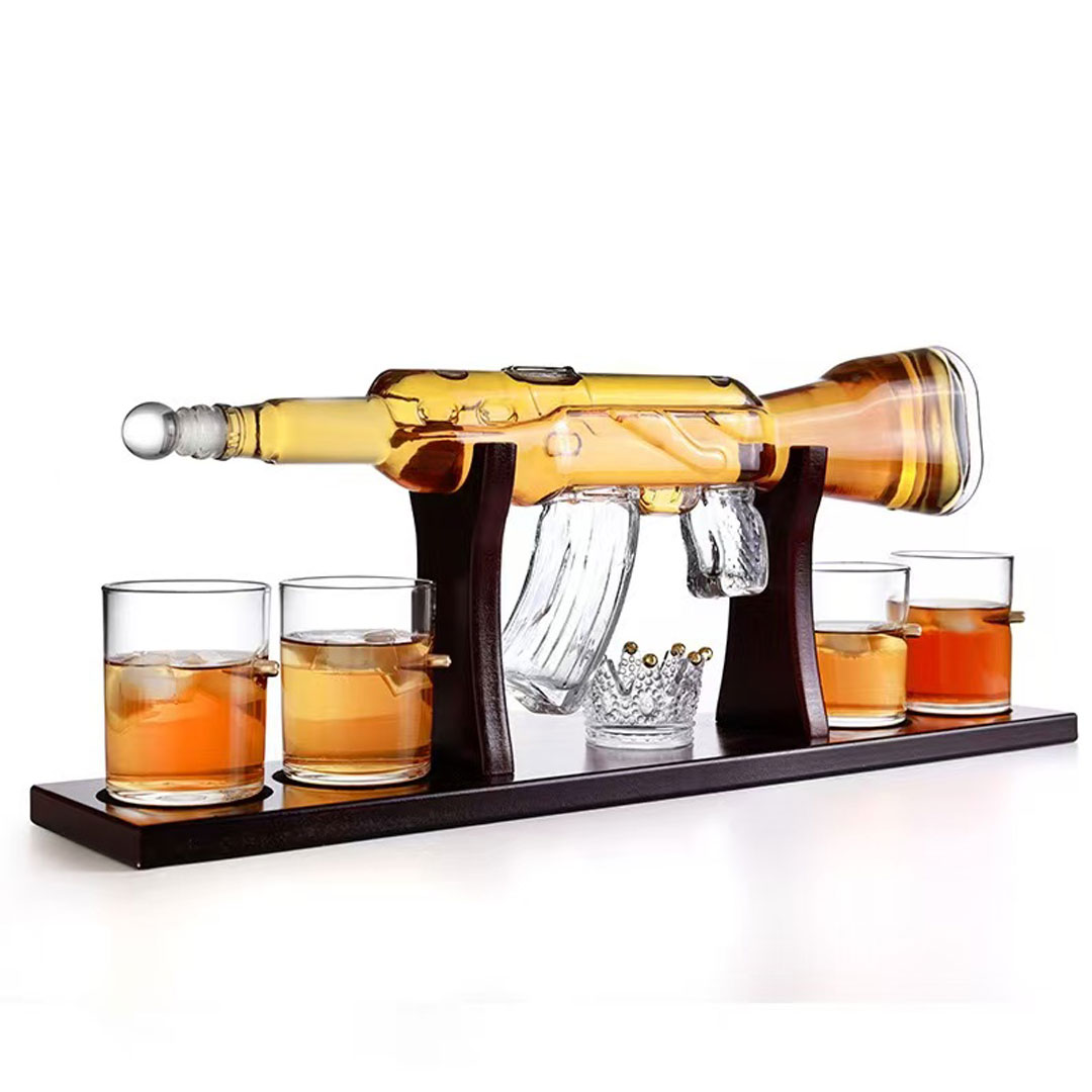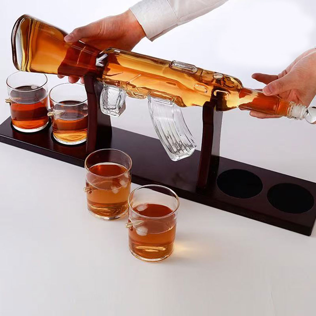 Unesite dozu adrenalina i originalnosti u vašu kolekciju pića uz Viski set u obliku Kalašnjikova. Ceo set je izrađen od visokokvalitetnog borosilikatnog stakla, dok je postolje od elegantnog drveta, što garantuje čvrstoću i sofisticiran izgled.