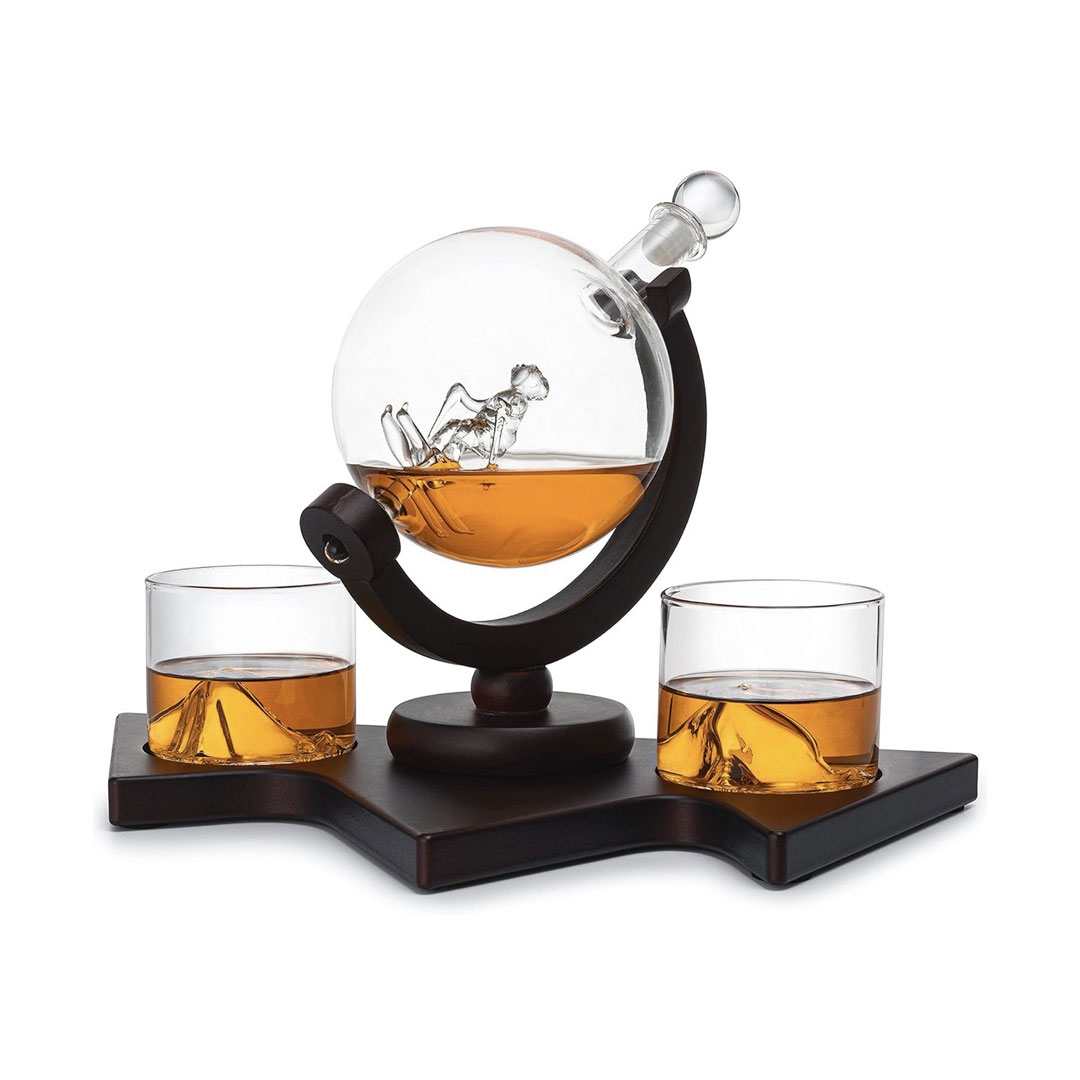 - U setu: Dekanter globus, dve čaše i drveno postolje