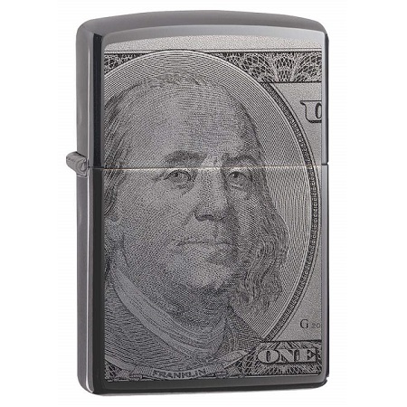 Lik sa najpoželjnije i najstilizovanije svetske valute smeši Vam se sa Zippo upaljača. Bendžamin Franklin ugraviran je posebnim Zippo procesom na prednju stranu klasičnog upaljača, modela Zippo Black Ice Curency 49025, i možda Vam donese sreću i privuče više novca.