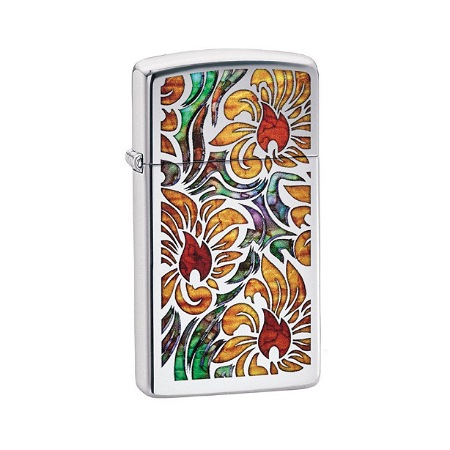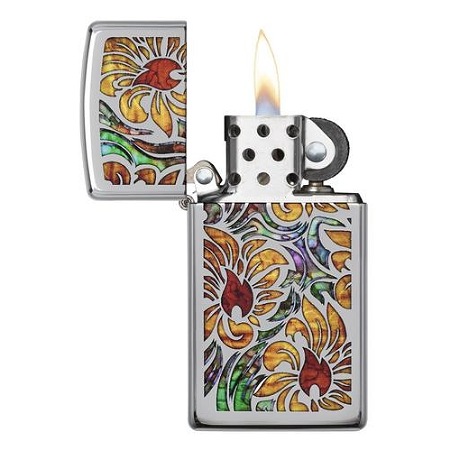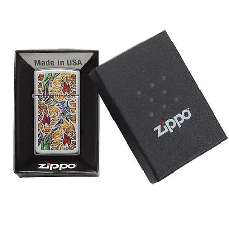 Ovaj Zippo upaljač je dokaz da vrhunska umetnost nekada može stati u džep. Na ovom modelu kao da se našao mali vitraž, prebogat toplim bojama. U centralnom delu svakog žutog cveta vešto je sakriven prepoznatljiv Zippo prikaz plamena, u crvenoj boji.