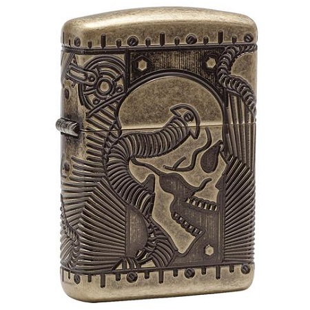 Model Zippo Steampunk 29268 inspirisan je steampunk dizajnom. Izgravirana je cela površina upaljača, specijalnim procesom 360° Multi Cut. Završna Antique obrada od mesinga verno dočarava steampunk stil. Na prednjoj strani je profil lobanje.