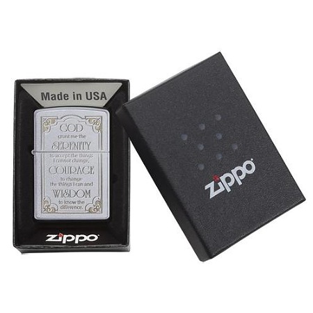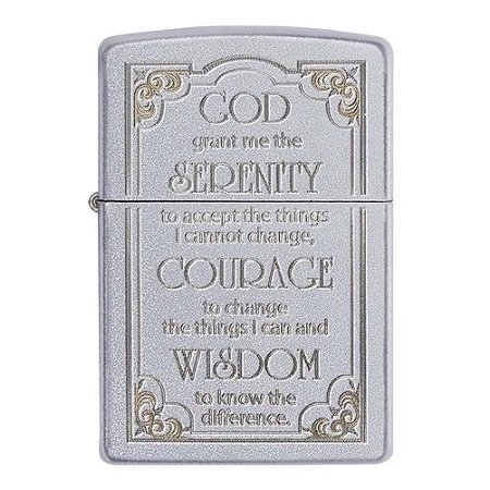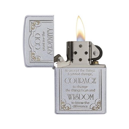 Zippo model upaljača Serenity Prayer 28458 svakodnevno će Vas podsećati na životnu snagu i inspirisati da činite dobro. Sa prednje strane, u ramu od tankih ugraviranih linija sa ukrašenim uglovima nalazi se natpis molitve:,, Daj mi Bože spokoj da prihvatim stvari koje ne mogu promeniti, hrabrost da promenim one koje mogu, i mudrost da ih razlikujem.“